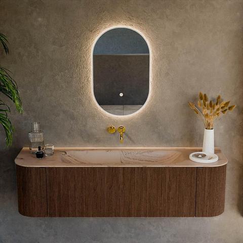 La forme rectangulaire avec coins arrondis à la fois du côté gauche et du côté droit offre un aspect moderne mais néanmoins accueillant. La couleur Walnut et les façades rainurées à structure verticale donnent immédiatement à votre salle de bains une apparence haut de gamme, digne d’un intérieur soigné. La teinte bois se marie très bien avec des accents noirs, de la céramique blanche ou au contraire du métal brossé, ce qui vous laisse une grande liberté pour l’aménagement complémentaire de votre salle de bains. Les formes arrondies créent en outre moins de lignes « dures » dans l’espace, ce qui apporte surtout dans les grandes salles de bains une atmosphère plus douce et accueillante. Vous faites ainsi entrer dans votre maison l’ambiance d’un hôtel design.