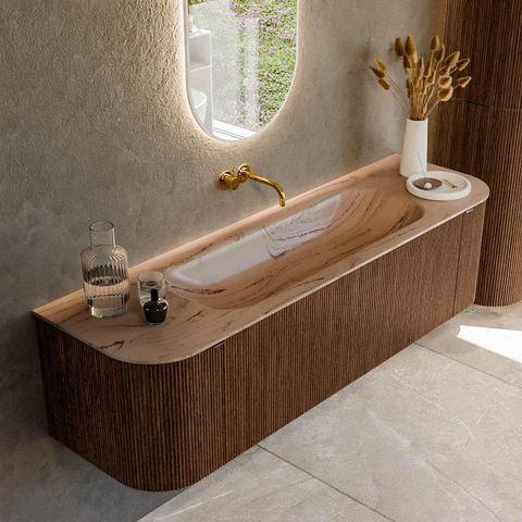 MONDIAZ KURVE-DLUX Meuble de salle de bains 160cm arrondi Gauche + Droite couleur Walnut avec 1 tiroir et 2 portes. Plan vasque BIG MEDIUM Central sans trou de robinet Arena.