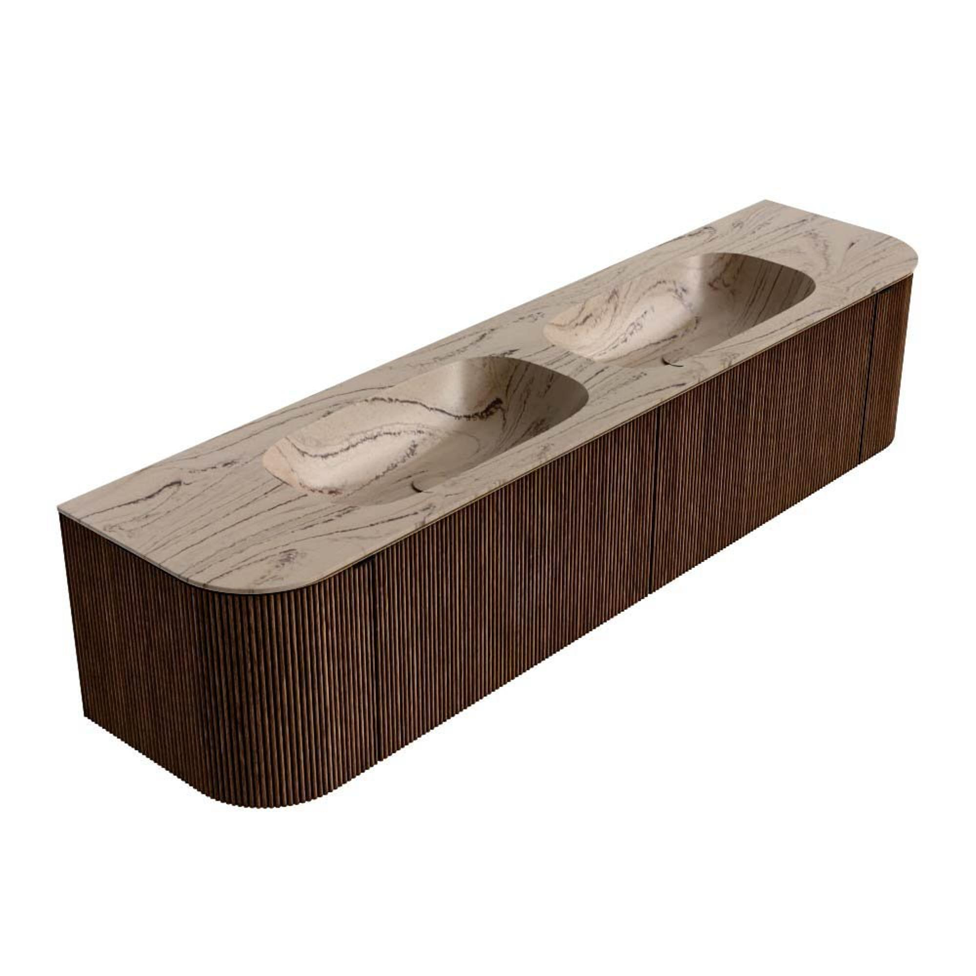 MONDIAZ KURVE-DLUX Meuble de salle de bains 190cm arrondi Gauche + Droite couleur Walnut avec 2 tiroirs et 2 portes. Lavabo STOR SMALL Double sans trou de robinet Arena.