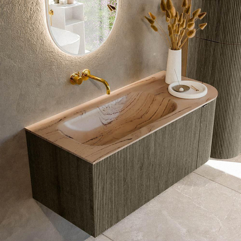 Le fameux arrondi sur le côté droit ne procure pas seulement une apparence élégante, il est également pratique dans le passage le long du meuble. Les angles sont adoucis, ce qui réduit le risque de se cogner, en particulier dans les salles de bains plus étroites ou en cas d’installation près de la porte ou de la douche. La largeur de 105 cm et la profondeur de 46 cm vous offrent un espace de lavage généreux, tandis que la faible hauteur d’environ 40 cm donne au meuble un aspect aérien suspendu au mur. La forme arrondie et la façade à rainures moderne avec texture verticale en font un véritable accroche-regard qui confère immédiatement à votre salle de bains un look haut de gamme et sur mesure.