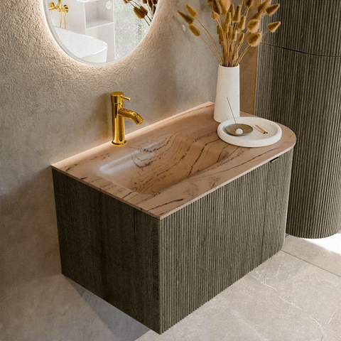 MONDIAZ KURVE-DLUX Meuble de salle de bains 75cm arrondi à droite couleur Shadow avec 1 tiroir et 1 porte. Lavabo GRUNNE à gauche 1 trou de robinet Arena.