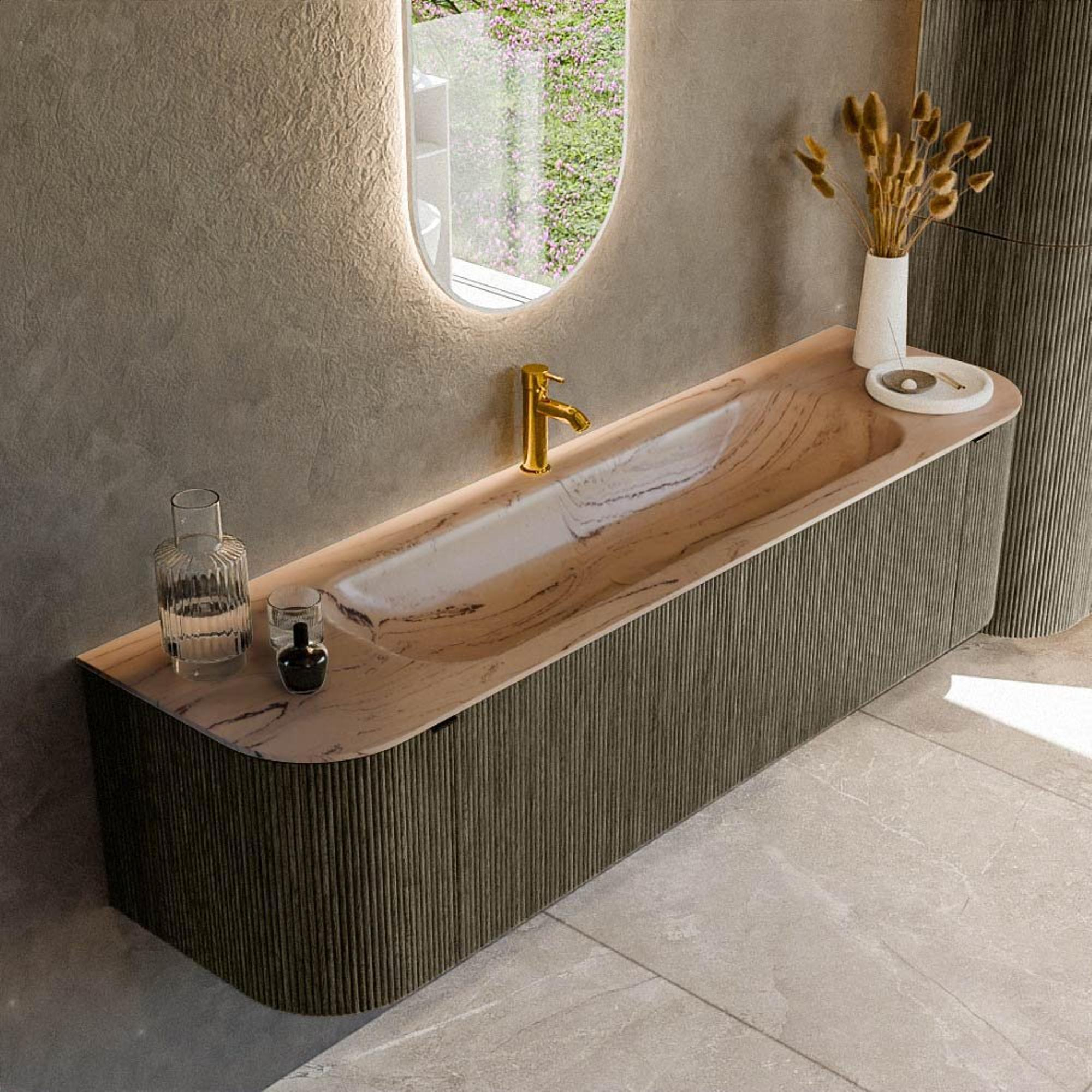La courbe élégante à la fois du côté gauche et du côté droit fait de ce meuble de salle de bains un véritable accroche-regard. La forme de base rectangulaire avec coins arrondis crée une apparence douce et accueillante, tandis que la teinte sombre Shadow et la façade nervurée avec structure verticale confèrent à l'ensemble un caractère moderne et architectural. Grâce au montage mural flottant, le meuble semble léviter, ce qui donne à votre salle de bains une impression de grandeur et laisse le sol bien visible. Cela rend le meuble particulièrement adapté aux salles de bains design, aux maisons neuves modernes et aux rénovations dans lesquelles vous souhaitez créer un look luxueux et équilibré. L'association avec la couleur Arena du lavabo crée un contraste subtil qui met magnifiquement en valeur les matériaux chaleureux et naturels tels que le bois et le carrelage.