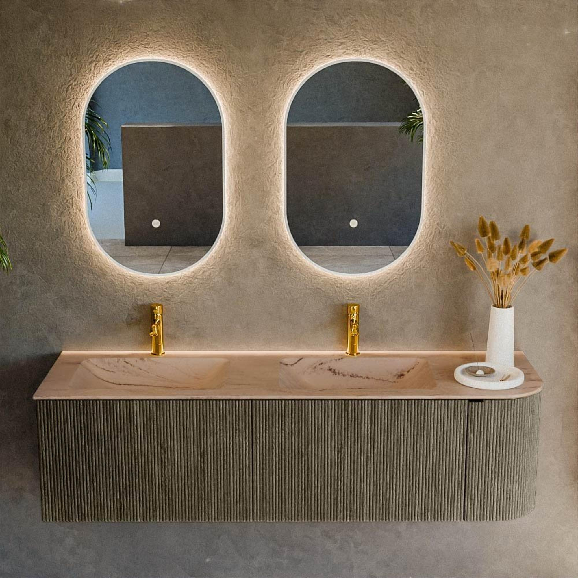 Si vous recherchez un meuble de salle de bains généreux qui donne immédiatement à votre salle de bains une apparence haut de gamme et design tout en utilisant intelligemment l’espace de rangement et l’agencement, alors ce modèle est parfaitement adapté pour vous. Avec sa largeur généreuse, il est idéal pour les salles de bains de taille moyenne à grande ou une salle de bains familiale luxueuse où plusieurs personnes utilisent le plan-vasque en même temps. La courbe douce sur le côté droit rend le meuble particulièrement adapté le long d’un passage ou près d’un angle où vous souhaitez un peu plus de liberté de mouvement, sans pour autant sacrifier l’espace de plan de travail. Les tons chauds de gris se marient à merveille aussi bien avec les salles de bains au look béton et industriel qu’avec un style hôtelier moderne et apaisant. Grâce au double lavabo avec deux trous de robinet, l’heure de pointe du matin devient beaucoup plus détendue, tandis que l’agencement astucieux avec tiroirs et porte permet de garder tous vos objets du quotidien bien rangés hors de la vue.