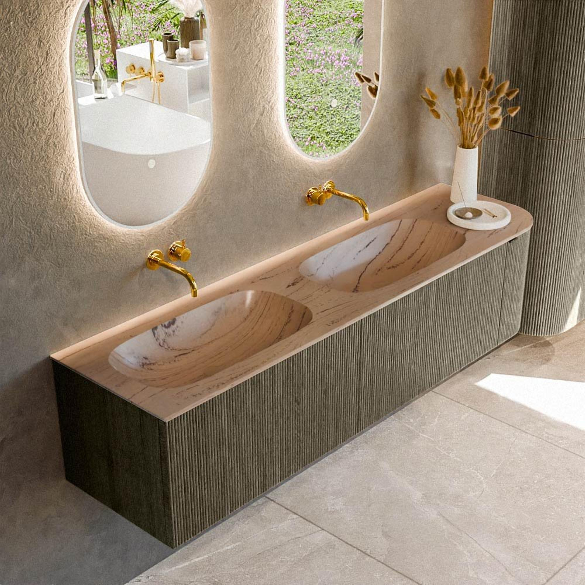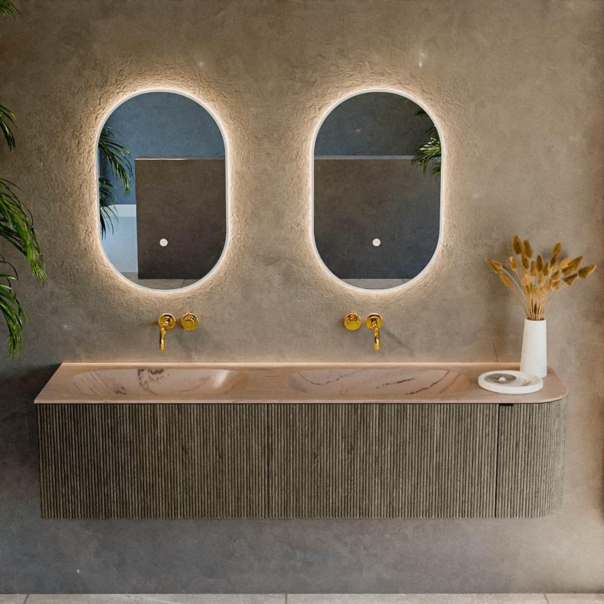 La courbure subtile sur le côté droit confère au meuble une forme douce et organique qui attire immédiatement le regard sans être trop voyante. Combinée à la teinte sombre Shadow et à la façade cannelée, elle crée une allure luxueuse et design qui donne à votre salle de bains l’ambiance d’un hôtel boutique. La base rectangulaire aux angles arrondis est sobre et moderne, tandis que la structure verticale de la façade apporte une profondeur et un caractère supplémentaires. Grâce à la largeur généreuse de 175 cm, ce meuble forme un véritable élément de caractère le long du mur, tout en conservant un aspect aéré grâce à la profondeur standard de 46 cm. Vous créez ainsi un espace lavabo chaleureux et haut de gamme, parfaitement assorti à des robinets noirs, des carreaux gris clair ou des accents de bois chaleureux.