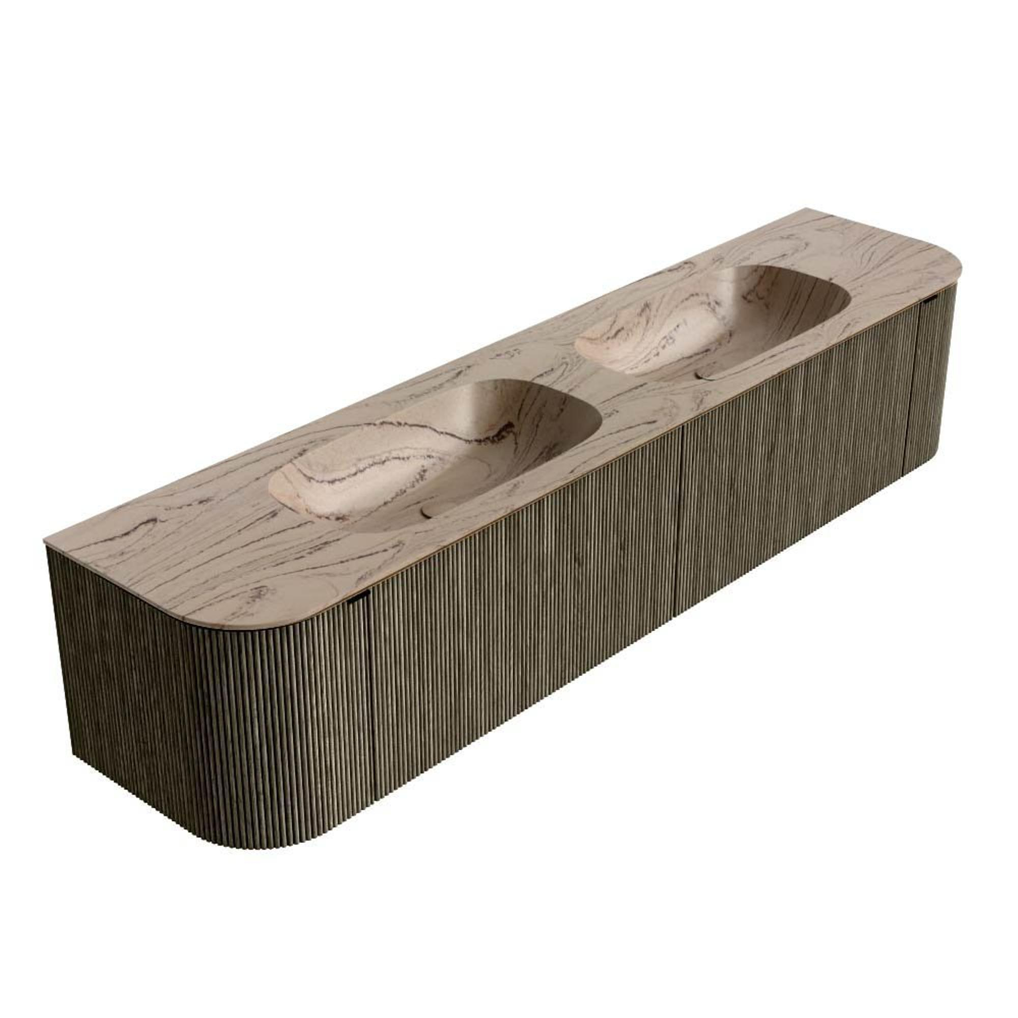 MONDIAZ KURVE-DLUX Meuble de salle de bains 200cm arrondi Gauche + Droite couleur Shadow avec 2 tiroirs et 2 portes. Lavabo STOR SMALL Double sans trou de robinet Arena.