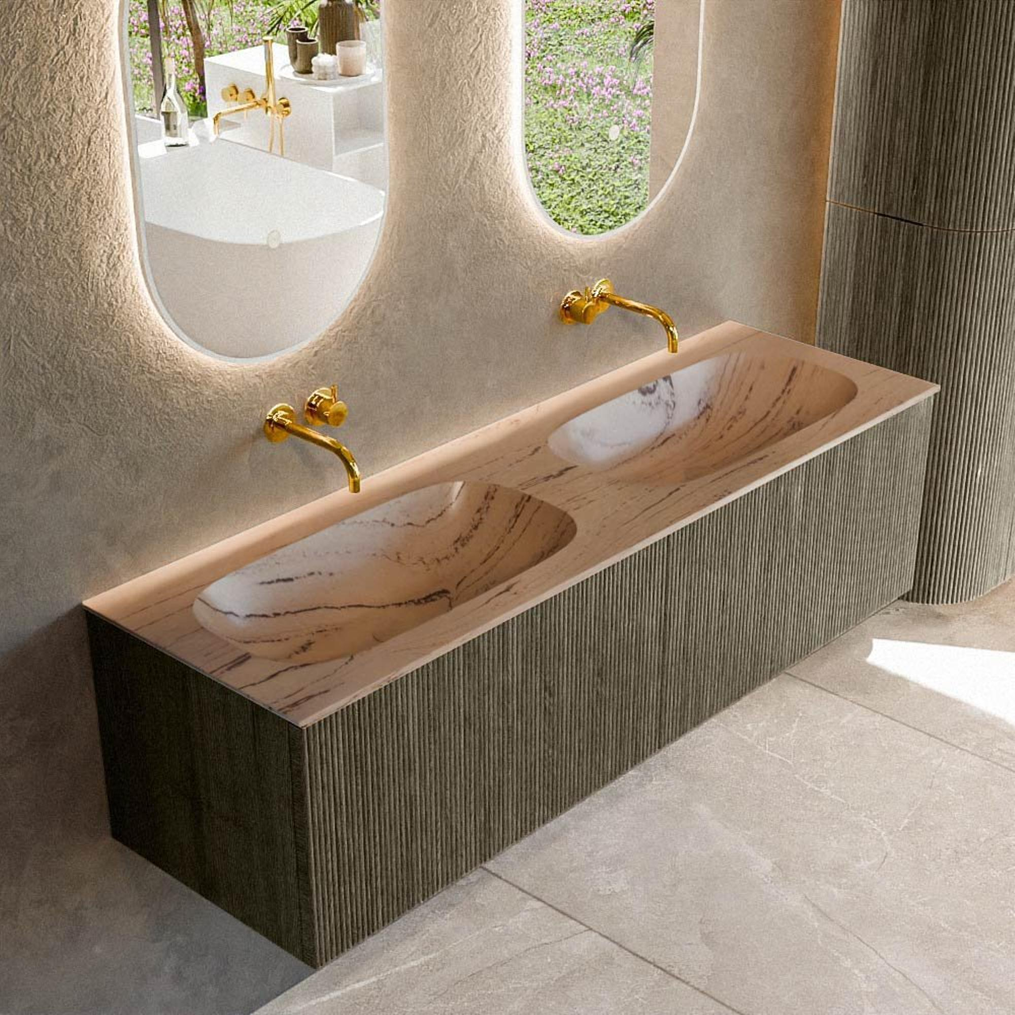 Avec ce meuble de salle de bains spacieux, vous créez en une seule fois une allure luxueuse digne d’un hôtel dans votre salle de bains. La largeur généreuse de 150 cm et le double plan-vasque rendent le meuble idéal pour une famille, un rituel matinal chargé ou pour ceux qui aiment simplement disposer d’un peu plus d’espace. Grâce aux lignes épurées, à la teinte chaude du bois et au plan de vasque élégant en Arena, il s’intègre parfaitement dans les salles de bains modernes et design, mais aussi dans un style de salle de bains chaleureux et naturel. Grâce au montage mural, le meuble semble flotter, ce qui apporte calme et sensation d’espace, même dans les salles de bains de taille moyenne. Si vous êtes à la recherche d’une combinaison de nombreux rangements, d’une finition haut de gamme et d’un look distinctif avec façades rainurées, il s’agit d’un choix particulièrement judicieux dont vous profiterez au quotidien.