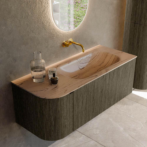 Le bel arrondi sur le côté gauche donne au meuble un caractère ludique et luxueux et évite les angles vifs sur le passage – particulièrement appréciable dans une salle de bains compacte ou très utilisée. Les façades avec structure nervurée verticale apportent une profondeur et un caractère supplémentaires, faisant immédiatement du meuble l'élément phare de la pièce. La couleur Shadow est une teinte de gris moderne au rendu chaleureux qui se marie parfaitement avec des matériaux naturels comme les carreaux effet bois, mais aussi avec des looks béton ou marbre épurés. En combinaison avec la vasque Arena, on obtient un ensemble élégant et haut de gamme qui s’intègre parfaitement dans les intérieurs contemporains. Grâce à la pose murale suspendue, la salle de bains paraît plus spacieuse et vous pouvez nettoyer facilement le sol en dessous.