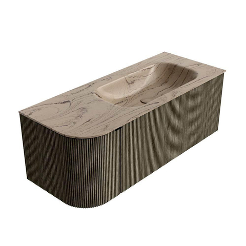 MONDIAZ KURVE-DLUX Meuble de salle de bains 115cm arrondi à gauche couleur Shadow avec 1 tiroir et 1 porte. Lavabo BIG SMALL à droite sans trou de robinet Arena.