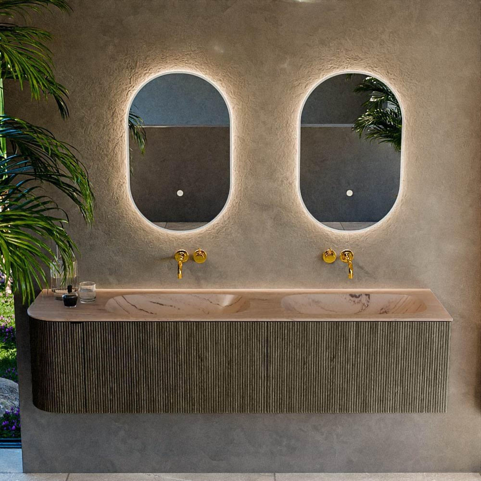 La couleur Shadow est une teinte grise moderne et profonde avec un aspect bois chaleureux, ce qui apporte immédiatement de l’ambiance à votre salle de bains. La façade rainurée verticale offre un look luxueux et architectural que l’on retrouve surtout dans les intérieurs haut de gamme. Cela fait du meuble un véritable accroche-regard, sans être criard. La forme rectangulaire aux angles arrondis et l’arrondi doux sur le côté gauche adoucissent les lignes et créent un ensemble accueillant et harmonieux. Grâce à la couleur sobre et neutre, vous pouvez facilement la combiner avec des robinets et accessoires noirs, gunmetal, chromés ou en laiton brossé, afin de personnaliser entièrement votre salle de bains selon votre propre style.