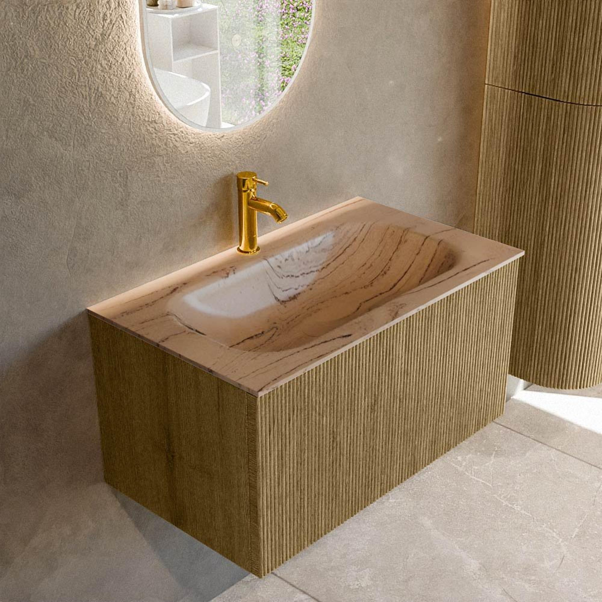 La structure nervurée verticale à l'avant donne immédiatement à ce meuble une apparence exclusive digne d'un intérieur. La gamme de coloris Bois dans la teinte Dusk s'accorde parfaitement avec des styles de salle de bains populaires tels que hôtel chic, organique moderne et scandinave chaleureux. En combinaison avec les formes semi-rondes et le design épuré et suspendu, on obtient un meuble qui fonctionne vraiment comme un élément accrocheur, sans être criard. Comme le meuble est fixé au mur, l'espace paraît en outre plus grand et le sol reste dégagé, ce qui s'accorde parfaitement, par exemple, avec de grands carreaux de sol ou un sol coulé sobre.