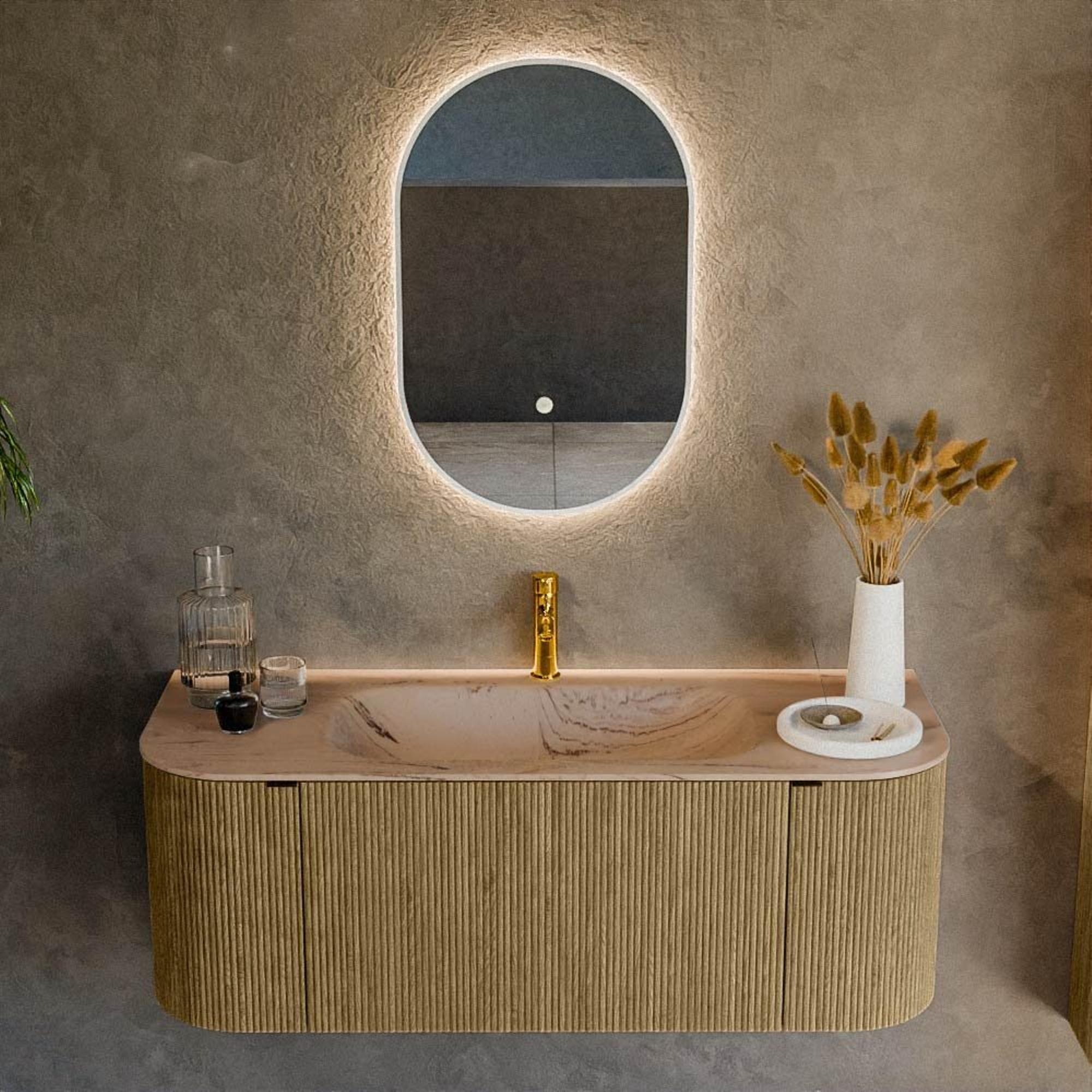 Les formes arrondies à gauche et à droite donnent au meuble un caractère convivial et contemporain, ce qui permet de rompre les lignes dures dans la salle de bains. La couleur Dusk combinée à la structure de bois apparente s'accorde à merveille avec des tendances d'intérieur populaires comme l'hôtel chic, le style scandinave moderne et le Japandi. La structure à nervures verticales sur la façade crée une profondeur et un luxe supplémentaires, faisant ainsi du meuble le point central immédiat de la salle de bains. Vous créez ainsi une atmosphère de spa, sans que l'ensemble paraisse chargé. La couleur Arena du lavabo forme un contrepoint doux et neutre au bois chaleureux, de sorte que vous pouvez facilement la combiner avec d'autres accessoires de salle de bains et robinets.