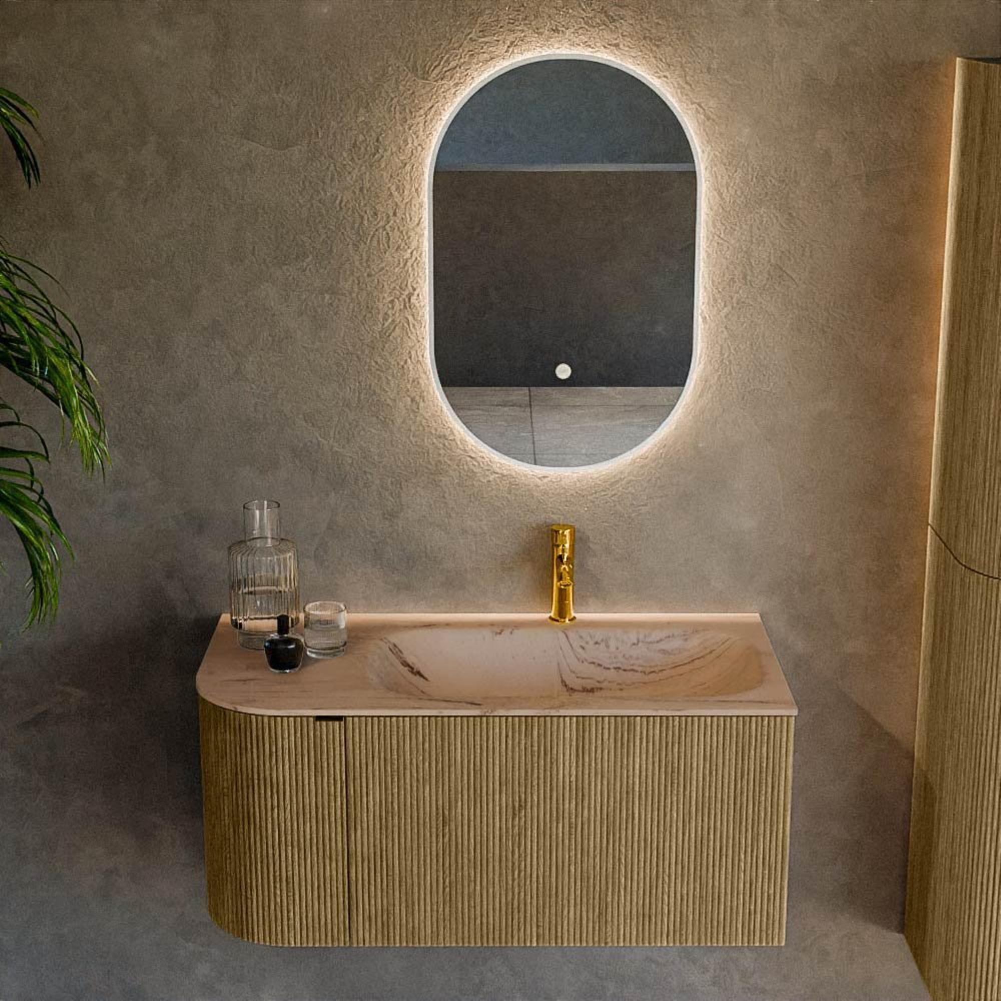 Le galbe marqué à gauche et la structure à nervures verticales en façade donnent immédiatement du caractère à ce meuble. La douce ligne semi‑ronde rompt les lignes souvent strictes de la salle de bains et crée un ensemble chaleureux et accueillant. Parallèlement, les nervures verticales ont une allure moderne et raffinée, ce qui permet au meuble de s'intégrer parfaitement dans des intérieurs contemporains, scandinaves ou de style hôtel chic. Comme le meuble est suspendu au mur, le sol reste dégagé