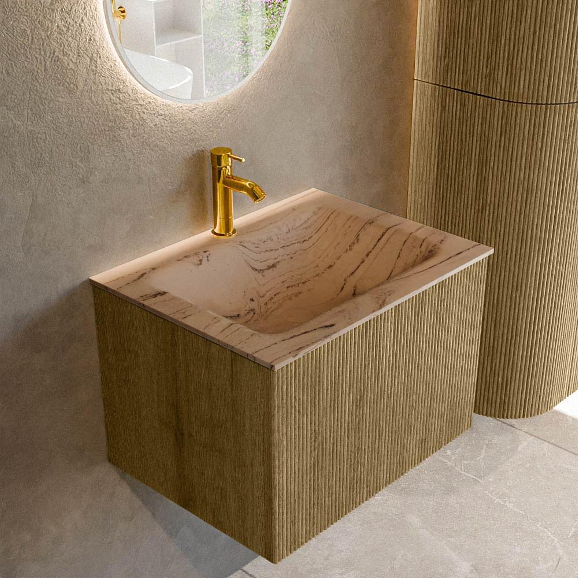 Le meuble se distingue immédiatement par sa façade rainurée verticale et la couleur moderne Dusk, une teinte de bois contemporaine qui dégage chaleur et luxe. Grâce au tiroir sans poignée avec système push-to-open, la façade reste épurée et calme
