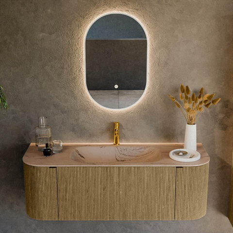 Ce meuble de salle de bains élégant est un choix parfait si vous recherchez une composition luxueuse et généreuse qui met à la fois l’espace de rangement et le design au premier plan. Grâce à sa largeur de 130 cm, ses formes arrondies et la combinaison d’un décor bois avec un lavabo discret de couleur Arena, ce meuble s’intègre parfaitement dans les salles de bains de taille moyenne à grande, par exemple dans une salle de bains familiale moderne ou une ambiance d’hôtel de luxe. La composition avec un grand tiroir, deux portes et le lavabo au centre offre une vue d’ensemble et une grande facilité d’utilisation dans le rythme quotidien : du rush du matin jusqu’à la routine du soir. La teinte chaude Dusk et la façade cannelée à lignes verticales confèrent immédiatement à votre salle de bains une apparence haut de gamme et accueillante, tandis que la pose murale crée un effet aérien et spacieux.