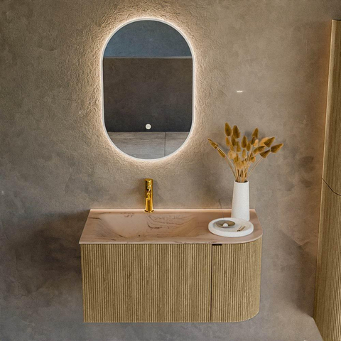 La forme arrondie sur le côté droit combinée aux façades verticales nervurées crée un aspect unique, presque organique. La couleur Dusk s’accorde à merveille avec les tendances actuelles de salle de bains telles que les tons terre et naturels, l’effet béton et les accents noirs. Les façades semi-circulaires en chêne massif apportent profondeur et texture à votre meuble, ce qui en fait un véritable point de mire dans la pièce. Comme la vasque est placée à gauche, une élégante courbe se forme à droite, qui n’est pas seulement esthétique, mais aussi agréable lorsque vous passez devant le meuble. C’est donc un excellent choix pour les salles de bains où vous souhaitez profiter d’un peu plus d’espace de mouvement sans sacrifier la capacité de rangement ni le style.