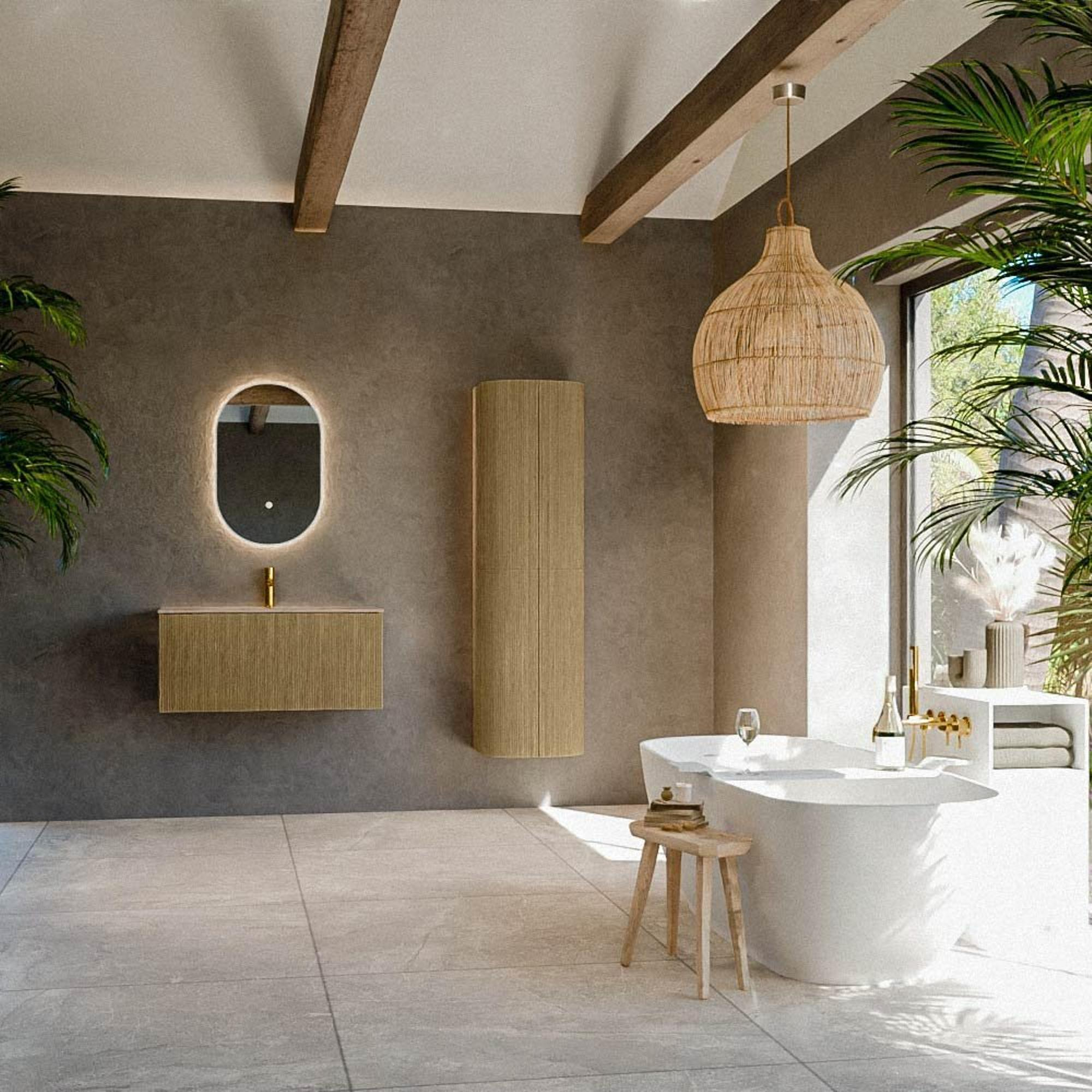 Les façades de couleur Dusk offrent un aspect profond et naturel qui se marie à merveille avec des carreaux clairs ou au contraire foncés. La structure à rainures verticales sur la façade crée un relief subtil et un aspect luxueux de meuble plutôt qu’un simple meuble de salle de bains standard. Comme le meuble est rectangulaire et fixé bien droit contre le mur, votre salle de bains bénéficie d’une base moderne et minimaliste, avec laquelle vous pouvez jouer à l’infini grâce aux accessoires : du style hôtel chic à une atmosphère scandinave apaisante. Le lavabo couleur arena renforce cette impression de sur-mesure et crée un contraste doux par rapport au bois.