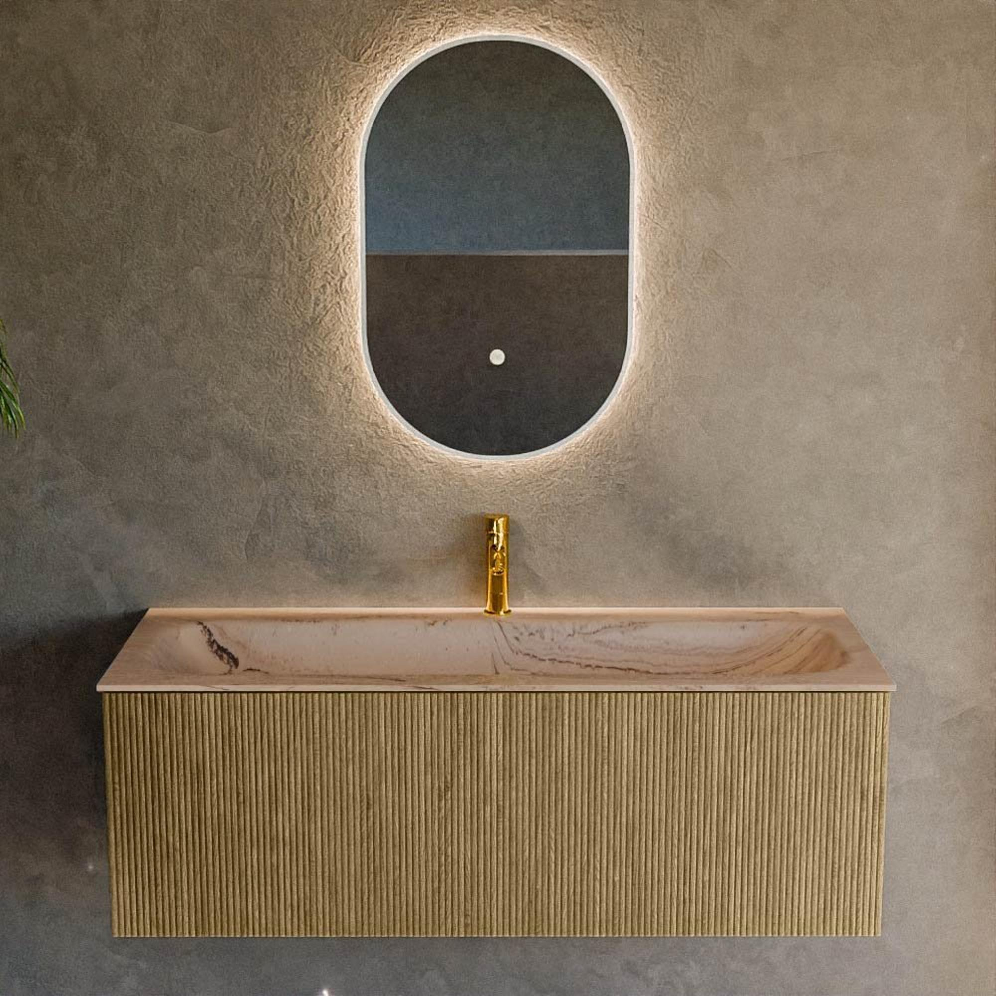 Avec un tiroir large et profond, vous exploitez de manière optimale toute la largeur de 120 cm. Cela signifie : beaucoup d’espace de rangement pour les serviettes, les produits de soin et les accessoires quotidiens de la salle de bains, bien à l’abri des regards mais toujours à portée de main. Le tiroir est équipé d’un système push-to-open, ce qui évite l’usage de poignées et permet de conserver une façade parfaitement épurée. Une légère pression suffit pour ouvrir le tiroir en douceur, même avec les mains mouillées. Grâce à l’agencement clair, vous gardez facilement votre salle de bains en ordre, ce qui contribue immédiatement à une atmosphère détendue et luxueuse dans la pièce.
