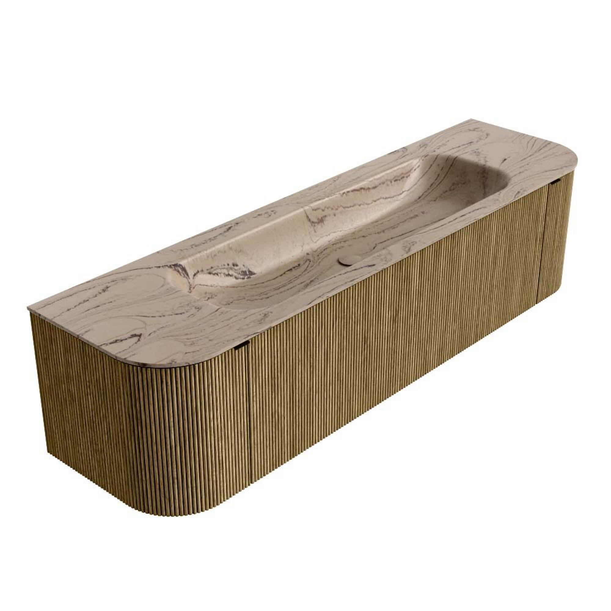 Les formes arrondies font de ce meuble un véritable élément phare, sans qu’il ne soit trop présent. Le galbe particulier à gauche et à droite adoucit les lignes de l’espace et donne l’impression que le meuble « flotte » contre le mur. La couleur Dusk avec texture bois et façades verticales côtelées confère un caractère raffiné, style hôtel chic, qui s’accorde parfaitement avec les robinetteries noires, bronze ou en inox. Comme la face avant se compose d’un seul dessin continu et harmonieux, l’ensemble paraît minimaliste et ordonné, même lorsque la salle de bains est utilisée de manière intensive. Vous créez ainsi une base intemporelle dont vous ne vous lasserez pas pendant des années.