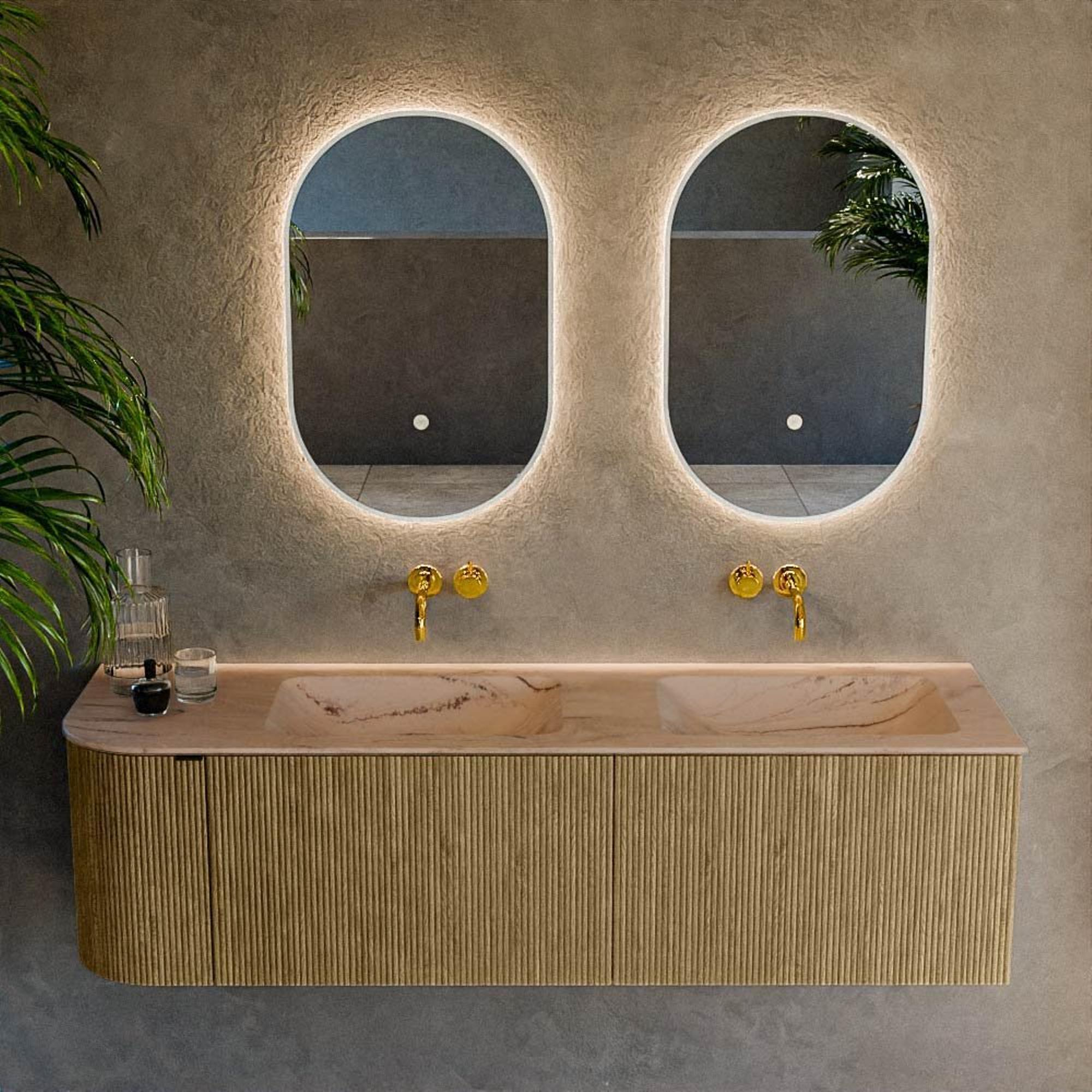 Avec ce meuble de salle de bains spacieux et courbé, vous créez en une seule fois un espace lavabo à la fois élégant et pratique, idéal pour une salle de bains familiale moderne ou une grande suite parentale. La largeur généreuse de 155 cm offre largement assez de place pour commencer la journée confortablement à deux, tandis que l’agencement bien pensé avec tiroirs et porte assure une apparence calme et ordonnée. Grâce à la forme arrondie sur le côté gauche, le meuble suit harmonieusement la ligne de la pièce, ce qui en fait un choix judicieux surtout pour les salles de bains plus étroites ou à l’agencement ludique. La combinaison d’une couleur bois chaude avec un plan vasque double discret couleur arena s’accorde parfaitement avec les intérieurs scandinaves, hôtel-chic ou modernes. Vous recherchez un meuble mural épuré avec beaucoup d’espace de rangement, un plan vasque double intégré et un design qui apporte une vraie plus-value à votre salle de bains ? Alors ce meuble répondra parfaitement à vos attentes.