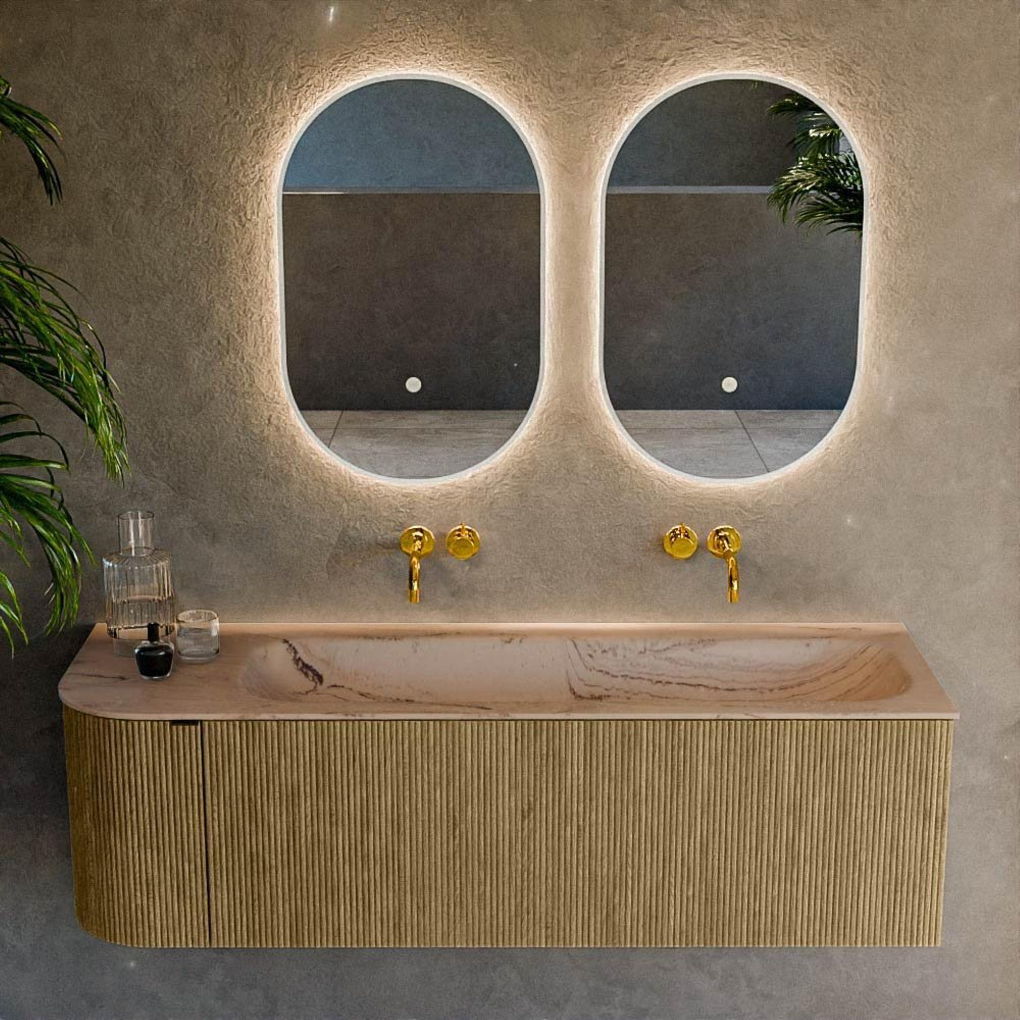 La forme arrondie avec courbe à gauche est idéale si vous placez le meuble le long d’un passage ou à côté d’une douche ou d’un bain. Pas d’angle vif contre lequel vous cogner, mais une ligne fluide qui apporte de la sérénité à l’espace. La dimension 145x46x40 cm est suffisamment généreuse pour un usage confortable par plusieurs membres de la famille, tout en conservant un aspect léger grâce à la profondeur limitée. La vasque simple à droite laisse un espace de plan supplémentaire à gauche pour des accessoires, un beau distributeur de savon ou une pile de serviettes de luxe. Vous combinez ainsi design et confort au quotidien, sans faire de concessions sur la fonctionnalité.