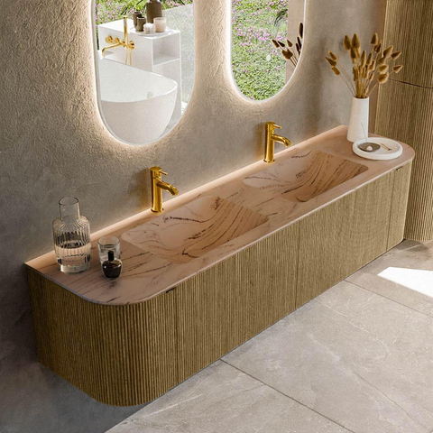 Les coins arrondis à gauche et à droite confèrent à ce meuble de salle de bains une silhouette fluide et unique qui attire immédiatement le regard, sans jamais être criarde. La couleur Dusk combinée à la structure nervurée verticale sur les façades crée une apparence luxueuse, proche d’un véritable meuble : davantage un buffet chic qu’une armoire de salle de bains standard. De ce fait, ce meuble trouve parfaitement sa place dans une grande salle de bains familiale ou parentale, mais aussi dans un loft élégant ou une maison neuve. Grâce à la fixation murale, le meuble semble flotter, ce qui agrandit visuellement et apaise votre salle de bains et facilite le nettoyage sous le meuble. Combinez-le avec des robinets et des accessoires noirs, blanc mat ou en métal brossé pour mettre encore plus en valeur la teinte chaleureuse du bois.