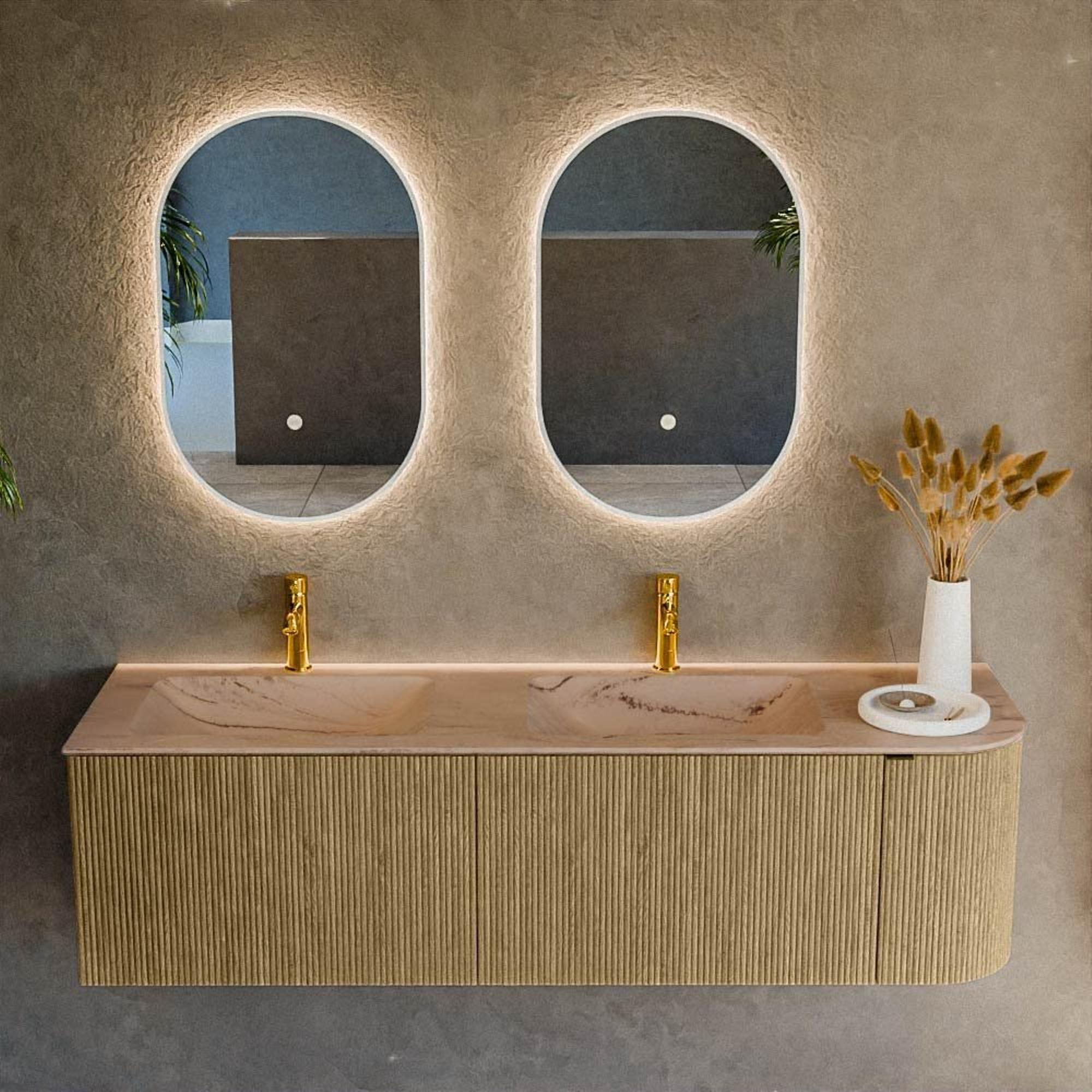 La couleur Dusk fait partie de la gamme de teintes bois et offre à votre salle de bains une base calme et naturelle. Les façades rainurées verticales apportent une apparence luxueuse avec beaucoup de profondeur et de caractère: exactement le type de détail qui donne à une salle de bains la sensation d'une suite d'hôtel haut de gamme. La structure bois se combine parfaitement avec des tons terre doux, des accents noirs ou par exemple des carreaux beiges et couleur sable, ce qui vous laisse beaucoup de liberté dans la conception de votre salle de bains. La forme arrondie combinée aux lignes droites du plan fait de ce meuble un véritable accroche-regard, sans être trop tape-à-l'œil. Vous créez ainsi une base intemporelle et élégante dont vous profiterez pendant de nombreuses années.