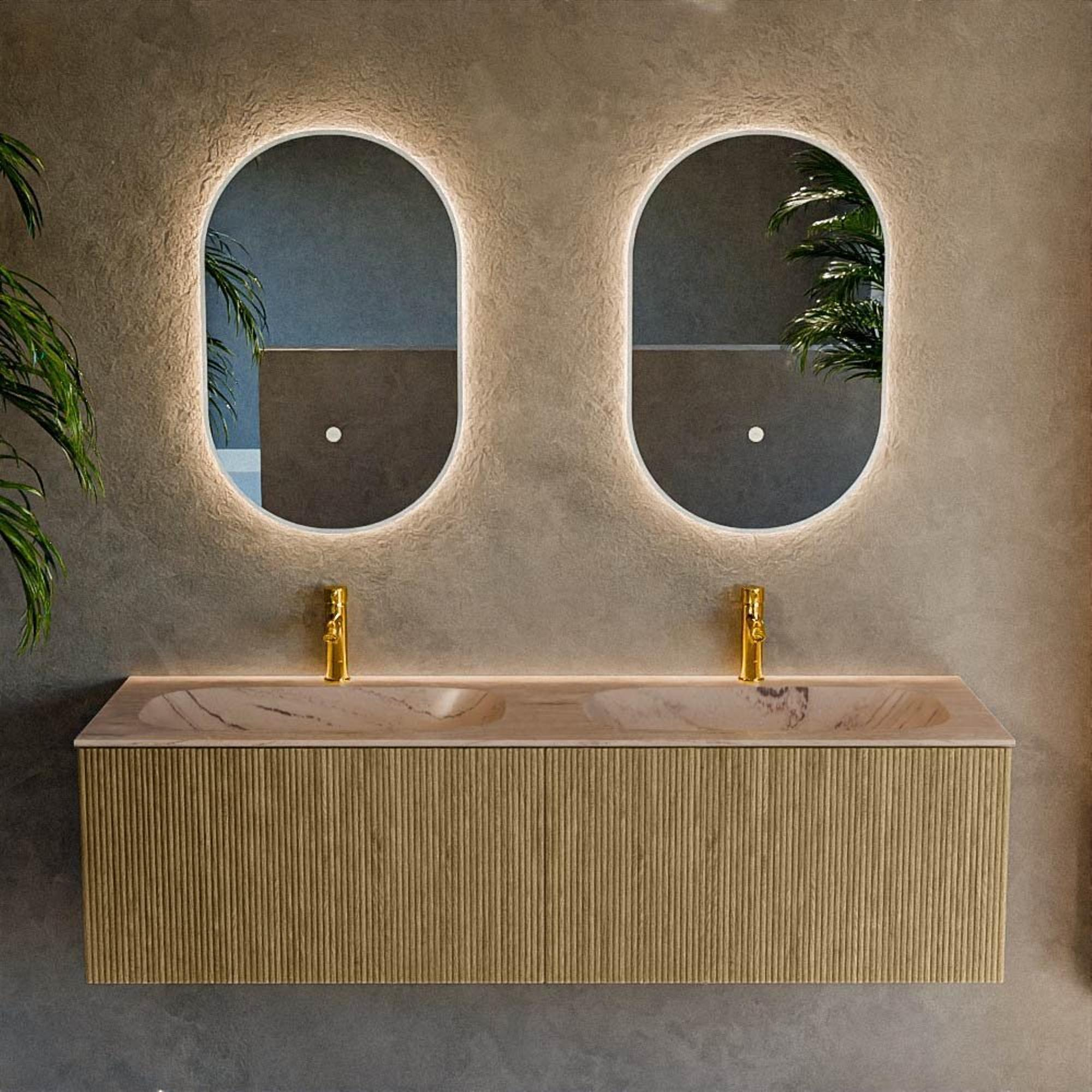 La chaleureuse couleur Dusk avec texture bois confère au meuble une apparence naturelle et exclusive qui apporte immédiatement de l’ambiance à votre salle de bains. La façade à nervures verticales crée un jeu de lumière intéressant et donne ce look moderne et design que l’on retrouve souvent dans les hôtels de luxe. Le fin plan en solid surface de couleur Arena forme un beau contraste : épuré, contemporain et subtil, sans être criard. Ensemble, ils créent un ensemble intemporel qui se marie facilement avec des robinets et accessoires noirs, inox ou chromés. Comme le meuble est suspendu au mur, le sol reste libre, ce qui donne une sensation d’espace et de légèreté, idéale aussi bien dans les salles de bains neuves que lors d’une rénovation haut de gamme.