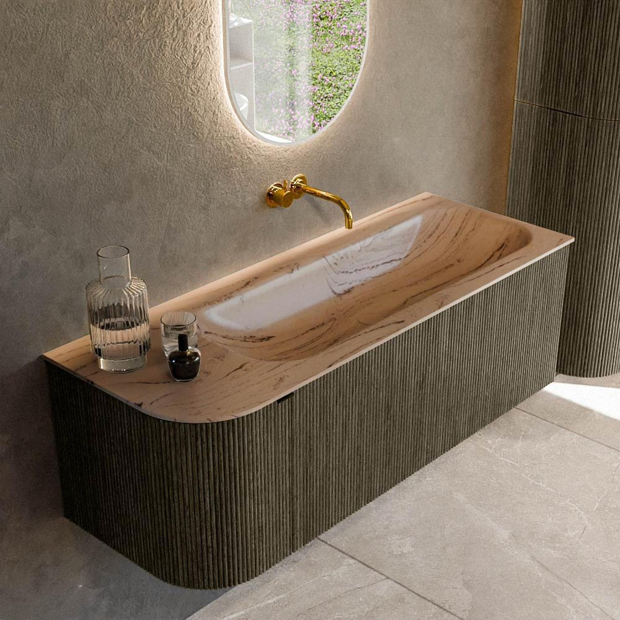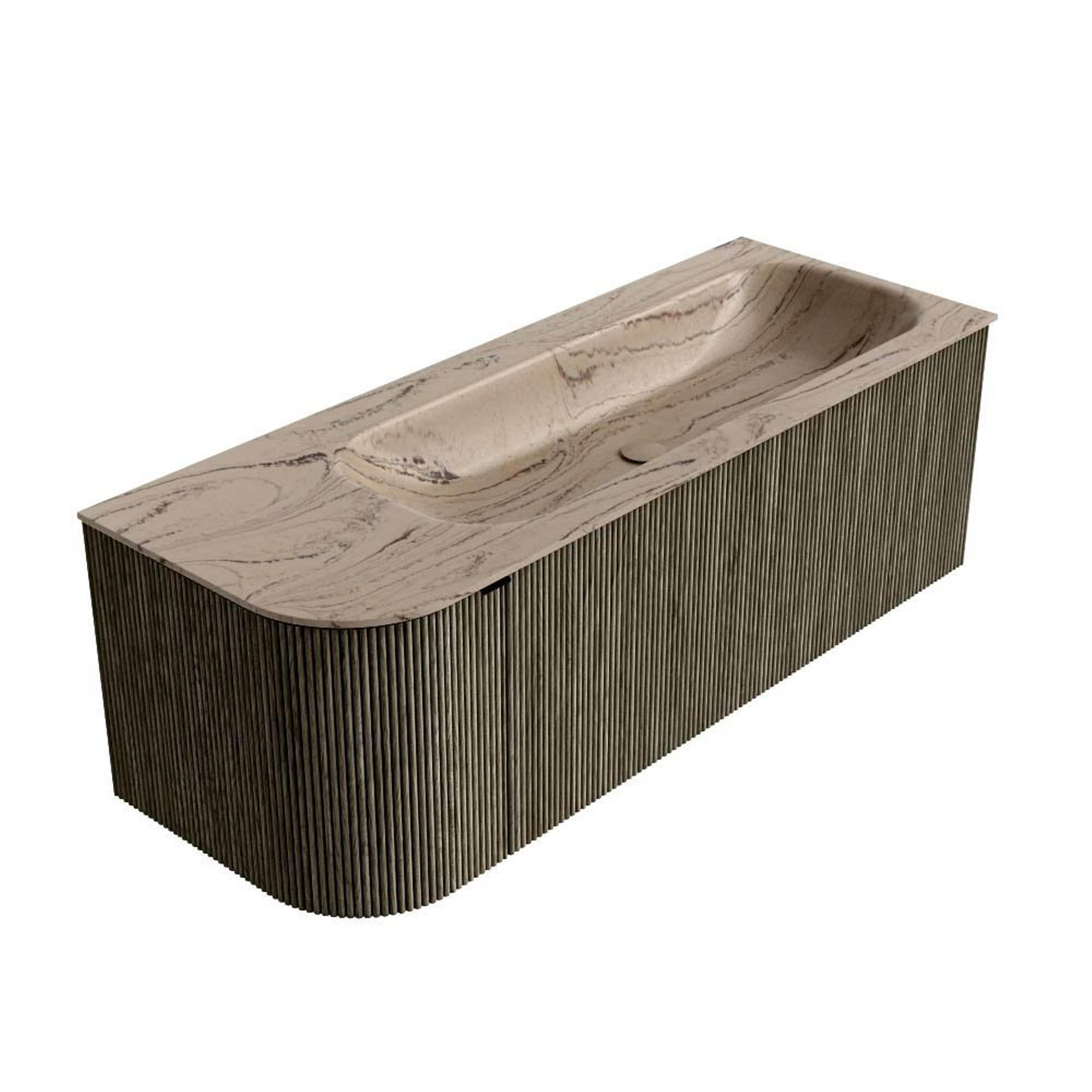 La subtile courbe à gauche et les façades côtelées à structure verticale donnent à ce meuble un caractère affirmé sans être criard. La couleur profonde Shadow crée une ambiance moderne, presque digne d'un hôtel design, surtout en combinaison avec des carreaux sobres et des accessoires minimalistes. Grâce à la forme semi-ronde, le meuble paraît en outre moins massif, ce qui apporte une sensation d'espace supplémentaire dans votre salle de bains. La vasque asymétrique à droite crée en plus une large surface de dépose à gauche, idéale pour vos produits de soin quotidiens ou un bel accessoire. Vous faites ainsi entrer chez vous un véritable accroche-regard qui n'est pas seulement agréable à regarder, mais qui donne aussi visuellement un niveau supérieur à votre salle de bains.
