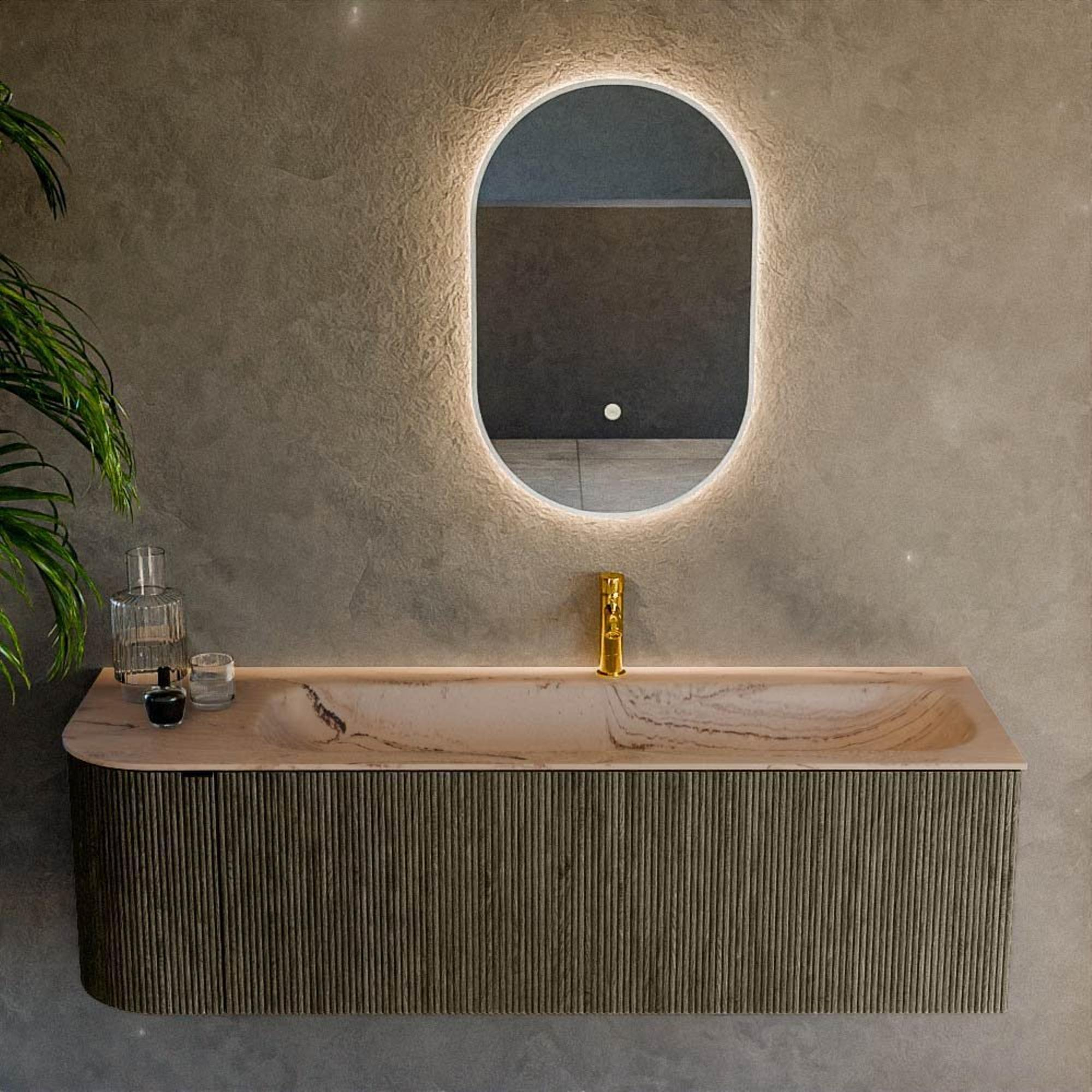 L’angle arrondi à gauche donne à ce meuble un caractère élégant et convivial, tandis que les lignes droites sur les autres côtés assurent un aspect moderne et épuré. La couleur Shadow est une teinte de gris profond au look luxueux et chaleureux, ce qui permet au meuble de se combiner parfaitement avec des murs et des sols blancs, couleur sable ou effet béton. La structure à rainures verticales sur les façades ajoute une profondeur subtile et de la texture, faisant immédiatement de ce meuble l’élément accroche-regard de votre salle de bains. Le plan dans la teinte Arena s’y raccorde parfaitement et crée un contraste doux qui rappelle la pierre naturelle. Ainsi, avec un seul meuble, vous créez une ambiance haut de gamme, presque comme une suite d’hôtel, sans que l’ensemble ne devienne chargé ou écrasant.