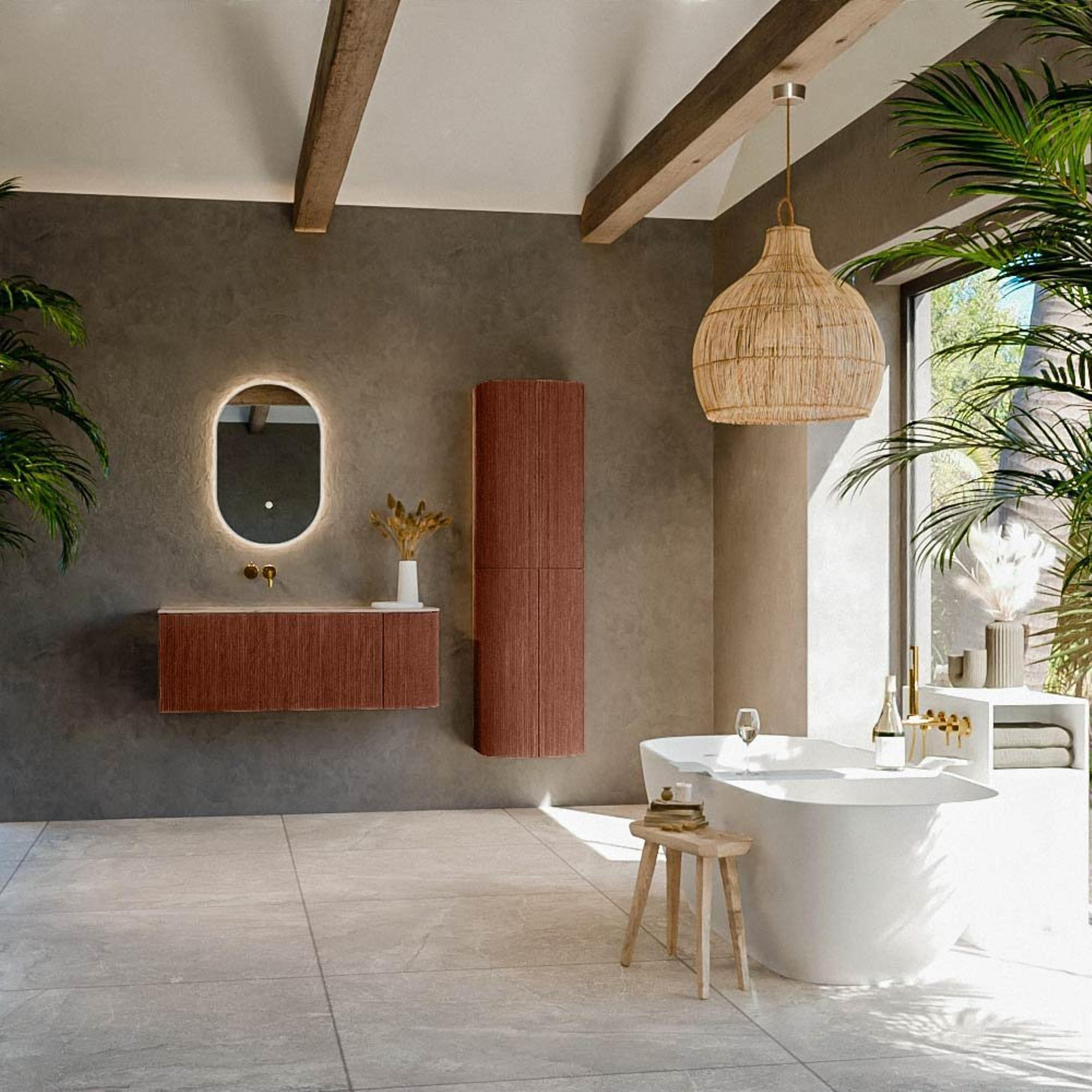 La teinte Ruby en combinaison avec la structure bois des façades donne une allure chaleureuse et chic qui se marie à merveille avec des tons terre, des accents noirs ou au contraire du sanitaire clair. Les façades sont en bois massif et les côtés sont finis avec du placage bois, ce qui vous permet de profiter de l’ambiance et de la qualité du vrai bois, tout en bénéficiant d’une structure durable et stable. Le lavabo et le plateau sont réalisés en Solid Surface couleur Arena : un matériau haut de gamme, à l’aspect épuré, avec un toucher soyeux. Ce matériau est réputé pour ses lignes droites, ses joints nets et son design intemporel, ce qui vous permet d’avoir un meuble véritablement luxueux dans votre salle de bains.