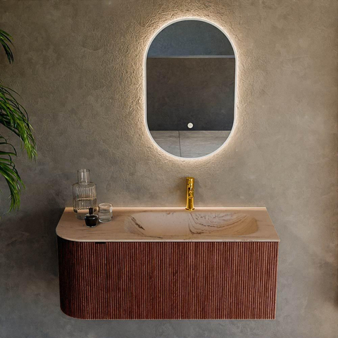 MONDIAZ KURVE-DLUX 105cm badmeubel ronding Links kleur Ruby met 1 lade en 1 deur. Wastafel BIG SMALL Rechts 1 kraangat Arena.