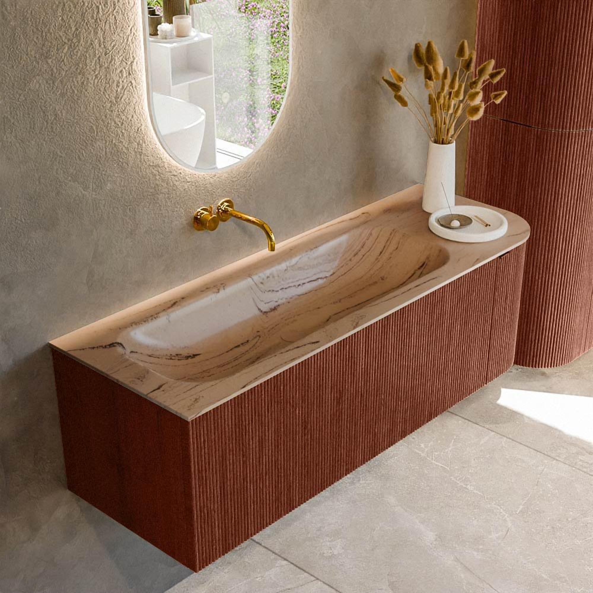 MONDIAZ KURVE-DLUX Meuble de salle de bains 135cm arrondi à droite couleur Ruby avec 1 tiroir et 1 porte. Lavabo BIG MEDIUM à gauche sans trou de robinet Arena.