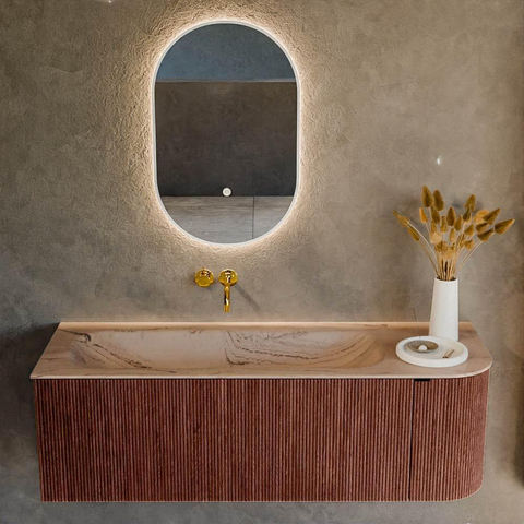 Le côté droit arrondi confère immédiatement à ce meuble de salle de bains un caractère particulier. Là où les lignes droites donnent souvent une impression stricte, la courbure ajoute au contraire douceur et luxe, donnant à votre salle de bains une véritable allure design. La couleur Ruby en fait un ensemble puissant : chaleureux, chic et parfaitement adapté comme accroche-regard contre un mur carrelé clair ou en combinaison avec des accessoires noirs ou laiton. La forme « rectangle aux coins arrondis » en combinaison avec la façade rainurée crée un jeu de lignes ludique qui fait paraître votre salle de bains optiquement plus grande et plus dynamique. Vous créez ainsi, avec un seul meuble, une base élégante pour l’ensemble de la conception de votre salle de bains.