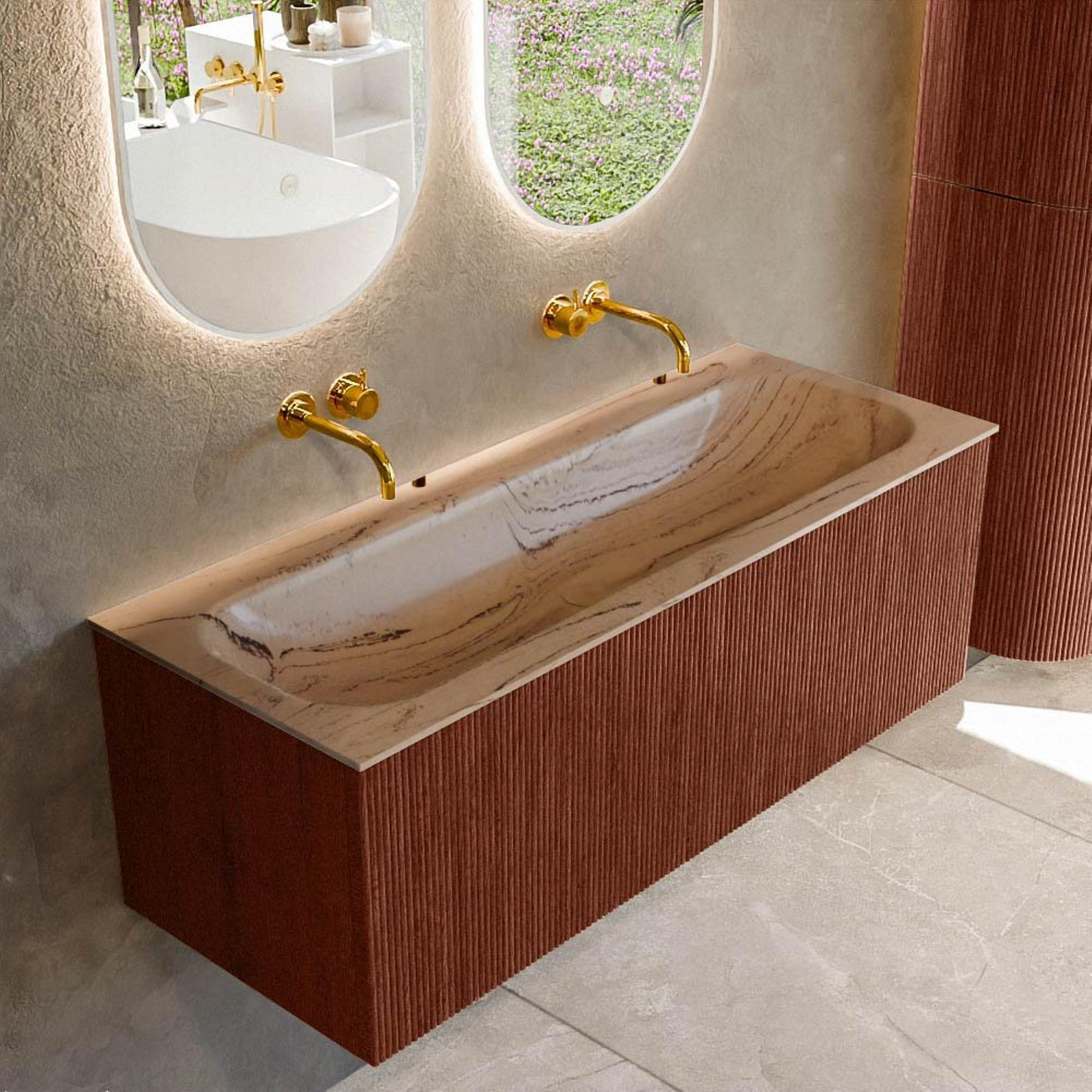 La couleur Ruby profonde combinée à la façade à rainures verticales confère à votre salle de bains une allure à la fois marquée et raffinée. Là où les meubles standard disparaissent souvent dans l'ensemble, ce meuble devient véritablement le point central de la pièce. La structure 3D des façades joue joliment avec la lumière, créant ainsi profondeur et ambiance, même dans une petite salle de bains. La couleur Ruby se marie étonnamment bien : pensez à des mitigeurs de lavabo noirs mats ou dorés, à des couleurs de carrelage neutres comme le blanc, le sable, le béton ou au contraire un carrelage foncé pour un effet dramatique. Comme le plan vasque est réalisé en solid surface et que le lavabo est de couleur Arena, vous obtenez un contraste élégant qui respire le calme et le luxe. Cela rend le meuble particulièrement adapté à ceux qui souhaitent créer une salle de bains unique et personnelle sans tomber dans des choix criards.