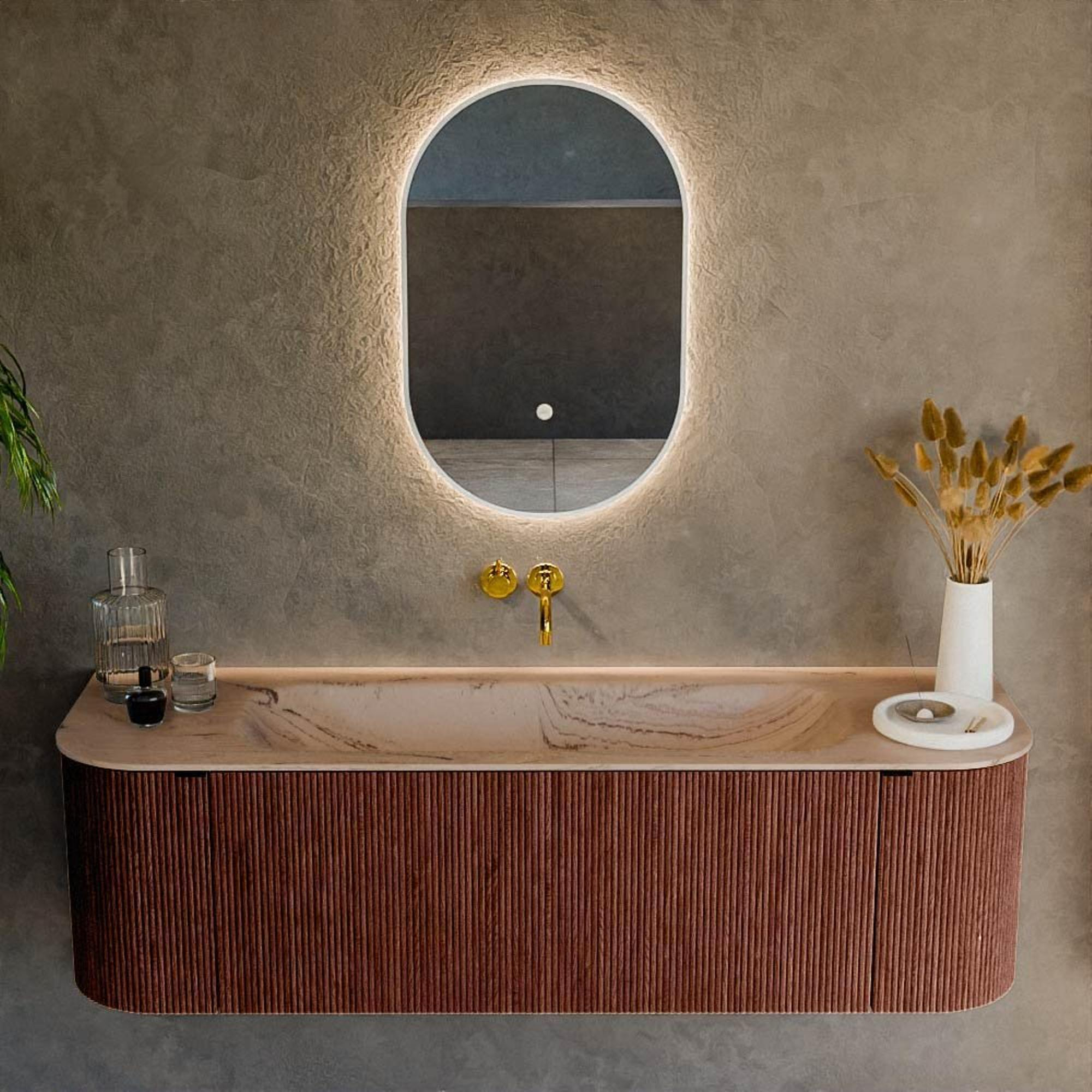 La combinaison des angles arrondis à gauche et à droite et de la couleur Ruby profonde donne immédiatement du caractère à votre salle de bains. Les formes arrondies adoucissent l'espace et conviennent parfaitement à un style d'intérieur moderne, organique ou orienté design. Le meuble paraît élancé grâce à la faible hauteur de 40 cm et au montage flottant, mais offre tout de même une largeur impressionnante de 150 cm qui remplit joliment votre mur. La couleur Arena du lavabo s'accorde subtilement avec la teinte chaude du meuble et se combine bien avec des carreaux neutres, des robinets noirs ou en laiton et d'autres accessoires de salle de bains. Vous créez ainsi en une seule fois un ensemble élégant qui semble à la fois tendance et intemporel.