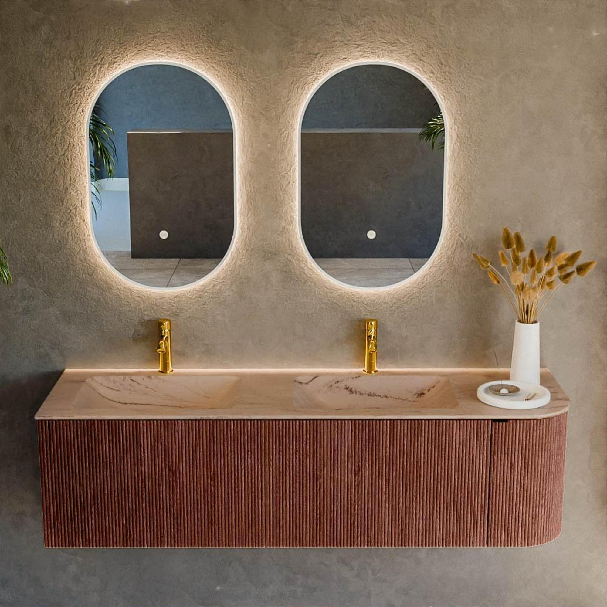 Si vous êtes à la recherche d'un meuble de salle de bains spacieux, à la fois pratique et résolument élégant, ce meuble est un excellent choix pour votre salle de bains. Grâce à sa grande largeur, il est idéal pour les salles de bains plus vastes ou une salle de bains familiale luxueuse où plusieurs personnes utilisent l'espace en même temps. La combinaison de la couleur chaude Ruby avec la teinte douce Arena de la double vasque crée une ambiance d'hôtel moderne, tandis que la forme arrondie et l'agencement bien pensé avec tiroirs et porte rendent l'utilisation quotidienne très confortable. Grâce à la pose murale, le sol reste dégagé, ce qui donne à votre salle de bains une apparence plus spacieuse et apaisante et facilite le nettoyage. Ce meuble donne le meilleur de lui-même dans une salle de bains contemporaine ou design, mais constitue également un élément fort dans un aménagement plus intemporel ou scandinave.