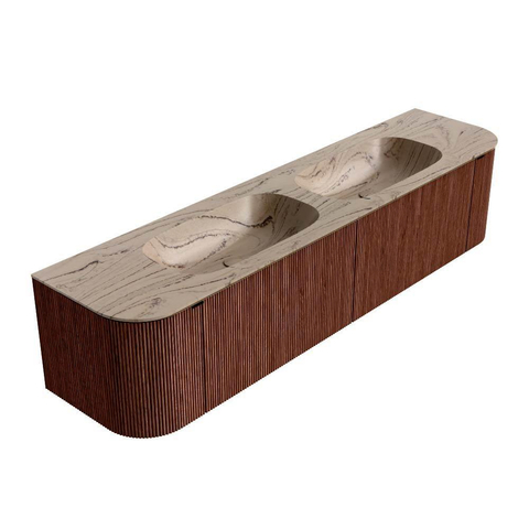 Avec une longueur de 190 cm et deux vasques généreuses, vous disposez de tout l'espace nécessaire pour utiliser confortablement le lavabo à deux personnes. Le plan de vasque en Solid Surface de couleur Arena est doux et agréable au toucher et s'accorde parfaitement en tonalité avec la couleur Ruby chaleureuse du meuble. Comme le lavabo est réalisé sans trous de robinet, vous pouvez choisir vous-même des robinets surélevés ou encastrés élégants qui correspondent au style de votre salle de bains. La configuration double rend les routines du matin et du soir plus claires : chacun son propre espace, moins de file d'attente devant le miroir et plus de calme dans la salle de bains.