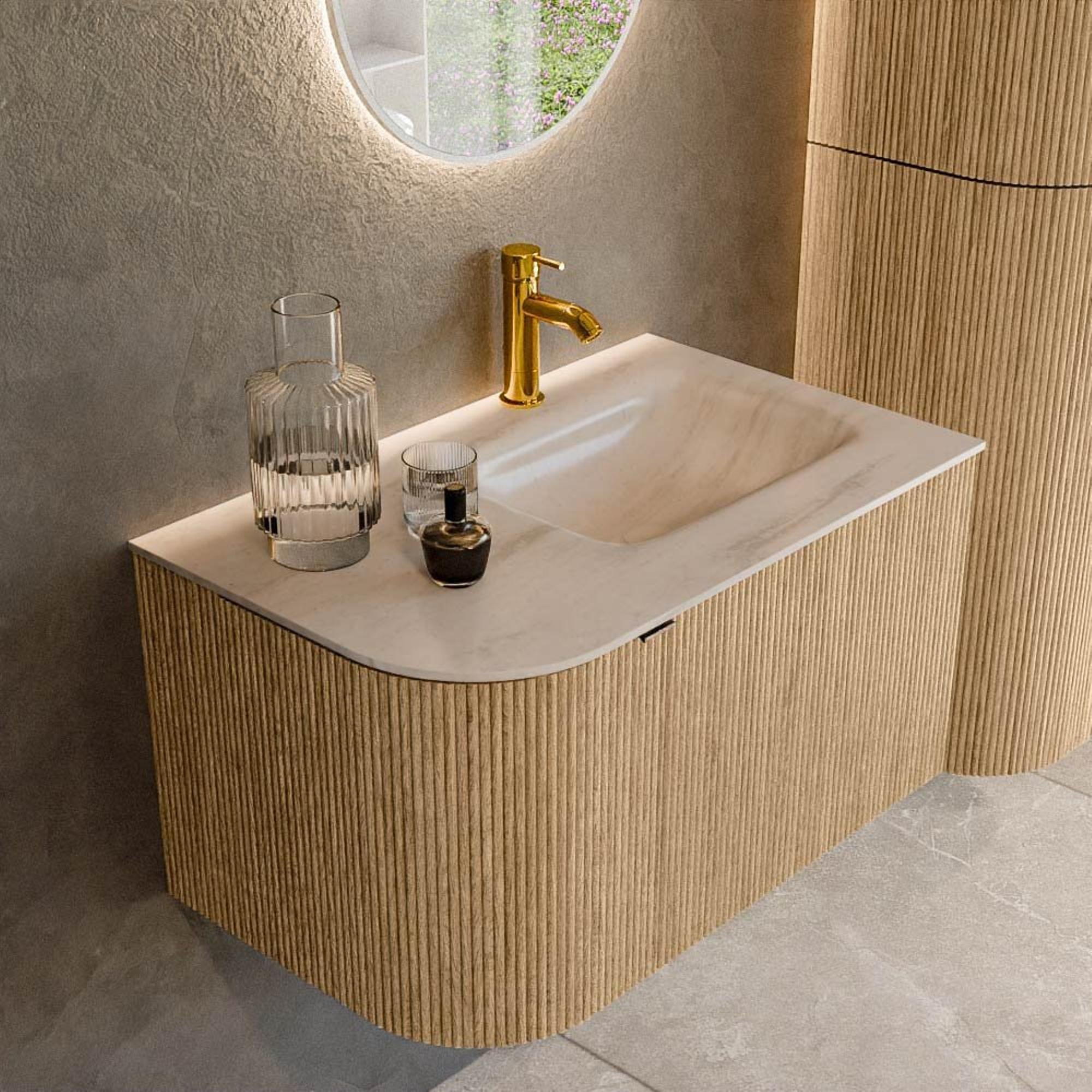 MONDIAZ KURVE-DLUX Meuble de salle de bains 75cm arrondi gauche couleur Oak avec 1 tiroir et 1 porte. Lavabo GRUNNE à droite 1 trou de robinet Meli.