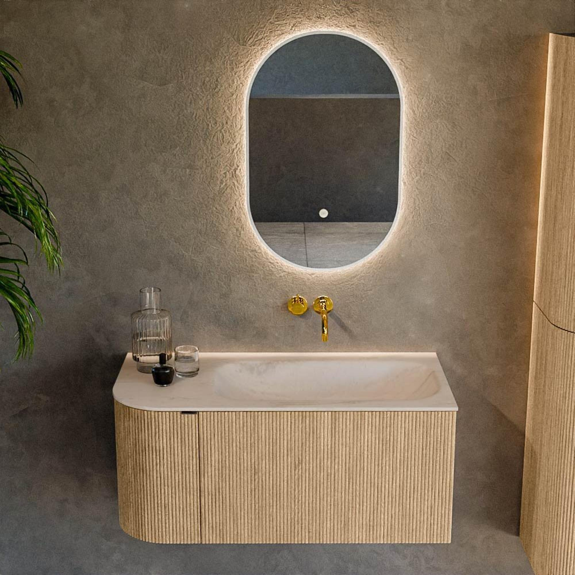 La teinte chaleureuse chêne donne immédiatement à votre salle de bains une atmosphère naturelle et apaisante. Associée au design moderne avec côté gauche arrondi, elle crée un bel équilibre entre ambiance chaleureuse et luxe contemporain. La structure verticale nervurée sur la façade ajoute de la profondeur et du caractère supplémentaires, de sorte que le meuble ne paraît pas plat mais bénéficie au contraire d’un subtil jeu d’ombres ludique. En optant pour une teinte bois au lieu d’un blanc intégral, vous apportez plus de convivialité dans la pièce, sans perdre en fraîcheur. Cela rend le meuble particulièrement adapté si vous aimez travailler avec des tons terre, des carreaux effet béton ou des accents noirs