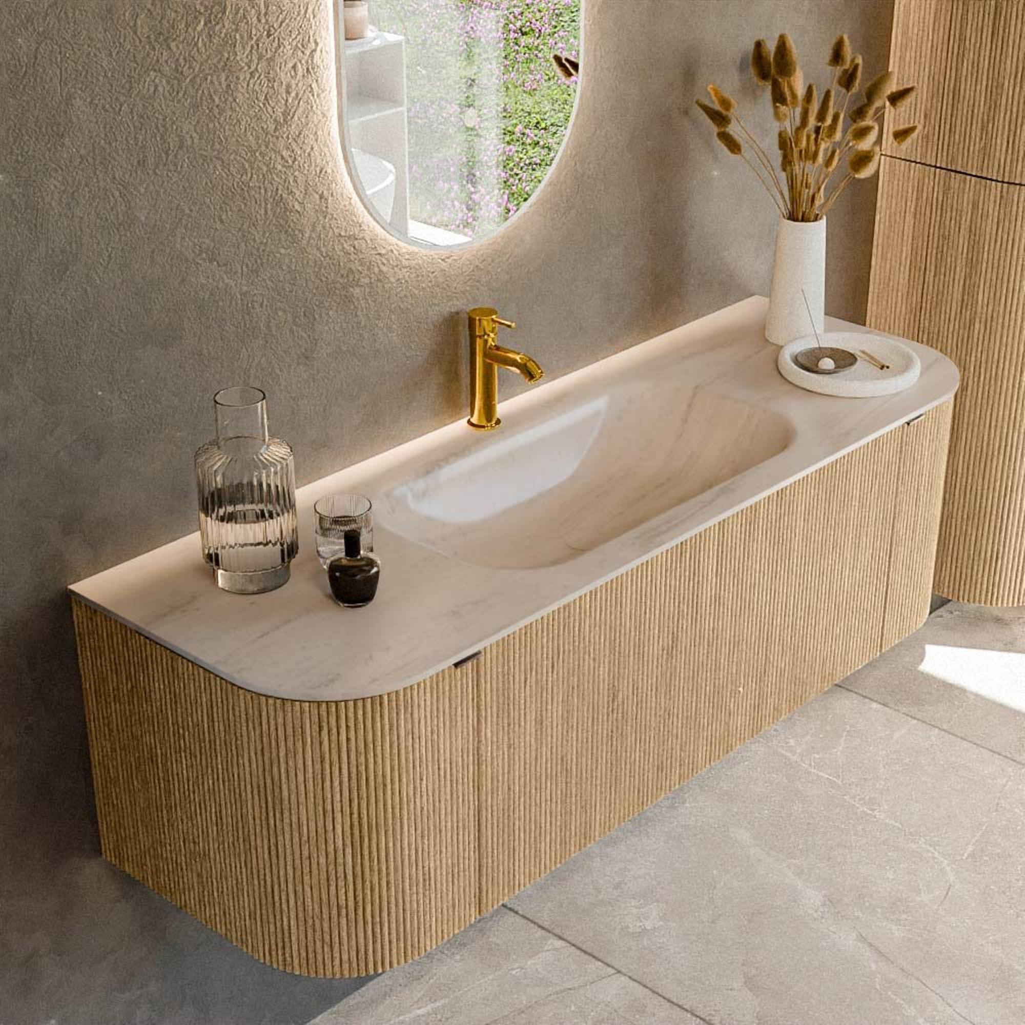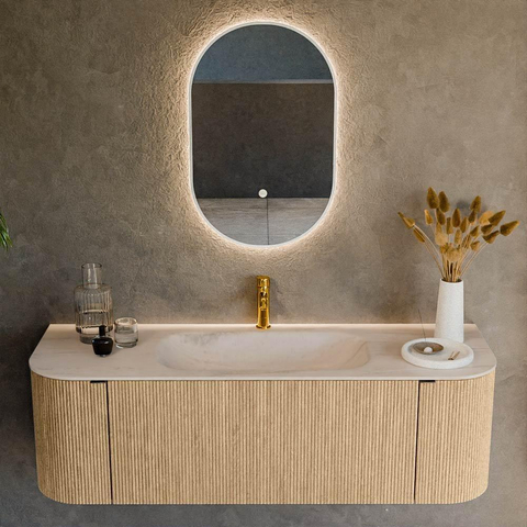 MONDIAZ KURVE-DLUX Meuble de salle de bains 140cm arrondi Gauche + Droite couleur Chêne avec 1 tiroir et 2 portes. Lavabo BIG SMALL Central 1 trou de robinet Meli.