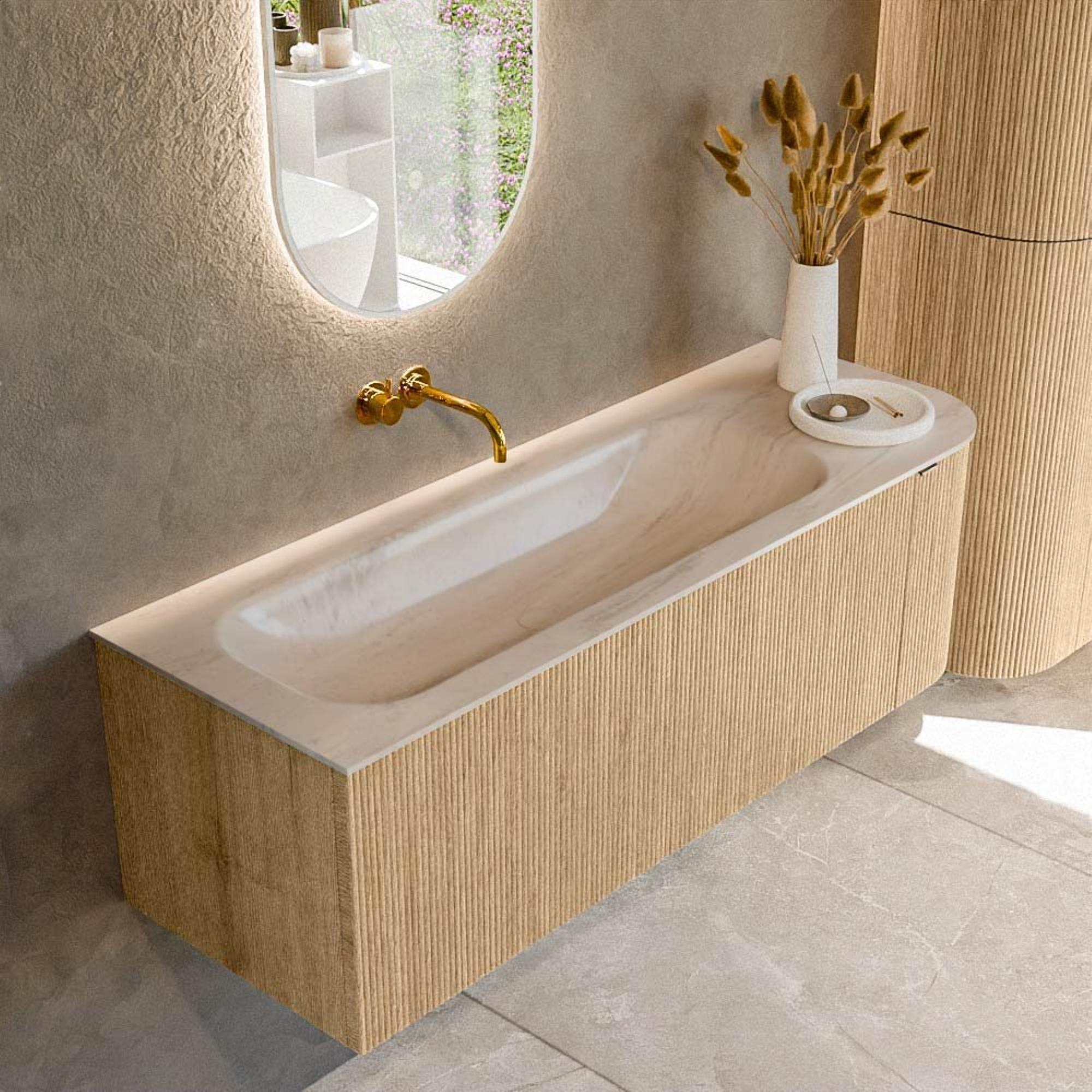 La subtile courbe sur le côté droit n’offre pas seulement une apparence douce et élégante, mais également un confort de passage supplémentaire dans votre salle de bains. Surtout le long d’un couloir ou près de l’entrée de la pièce, vous remarquerez la différence : pas d’angles vifs contre lesquels se cogner, mais une forme fluide et agréable au toucher. La forme « rectangle aux angles arrondis » s’accorde parfaitement avec des carreaux modernes et des robinets au design épuré, tandis que le côté arrondi rend l’ensemble un peu plus chaleureux. Grâce à la largeur de 135 cm, vous disposez de suffisamment d’espace de plan pour les objets du quotidien, tout en conservant un jeu de lignes fin et aéré. Cela rend ce meuble très adapté pour faire une déclaration sans qu’il ne devienne dominant.