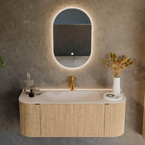 La combinaison des angles arrondis et de la couleur chêne crée une apparence apaisante et luxueuse qui attire immédiatement le regard sans être criarde. Les façades avec structure à nervures verticales apportent une profondeur et un caractère supplémentaires, donnant ainsi à votre salle de bains une allure haut de gamme. Comme le meuble est réalisé dans une belle teinte bois, il se combine parfaitement avec des éléments sanitaires blancs, des robinets noirs ou en métal brossé et aussi bien avec des carreaux clairs que foncés. L'arrondi à la fois à gauche et à droite crée une ligne fluide le long du mur, idéal si vous recherchez une alternative plus douce aux meubles stricts et anguleux. Vous créez ainsi une base intemporelle dont vous profiterez pendant de nombreuses années.