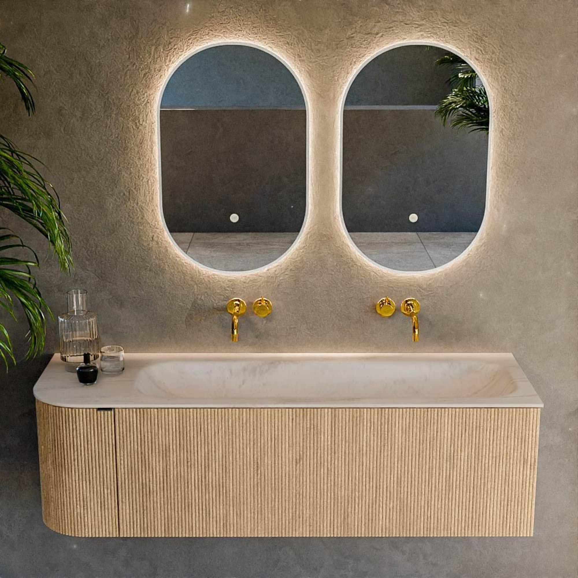 La couleur chêne confère immédiatement à votre salle de bains une atmosphère chaleureuse et naturelle. Combinée à la façade à rainures verticales, elle crée une sensation luxueuse et design que l’on retrouve surtout dans les salles de bains d’hôtels. Cette structure capte la lumière de belle manière, donnant vie au meuble visuellement et évitant un aspect plat. La commande sans poignée avec système push-to-open renforce le caractère minimaliste : pas de poignées saillantes, mais des lignes épurées qui s’harmonisent parfaitement avec des carreaux modernes et des robinets au fini soigné. La forme arrondie sur le côté gauche adoucit le look et évite les angles vifs dans le passage, ce qui est à la fois un avantage esthétique et pratique, surtout en présence d’enfants.