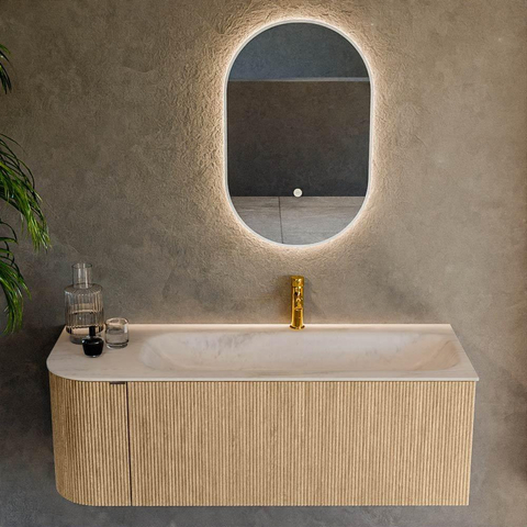 L’arrondi caractéristique sur le côté gauche confère à ce meuble de salle de bains une forme élégante, presque organique, qui fait immédiatement la différence dans votre salle de bains. La couleur Oak s’accorde parfaitement avec les tendances d’intérieur populaires telles que le style scandinave, le moderne naturel et le style hôtel chic, ce qui vous permet de l’associer facilement à des robinets et accessoires noirs, blancs ou métalliques. La forme de base rectangulaire avec angles arrondis paraît épurée, mais jamais rigide