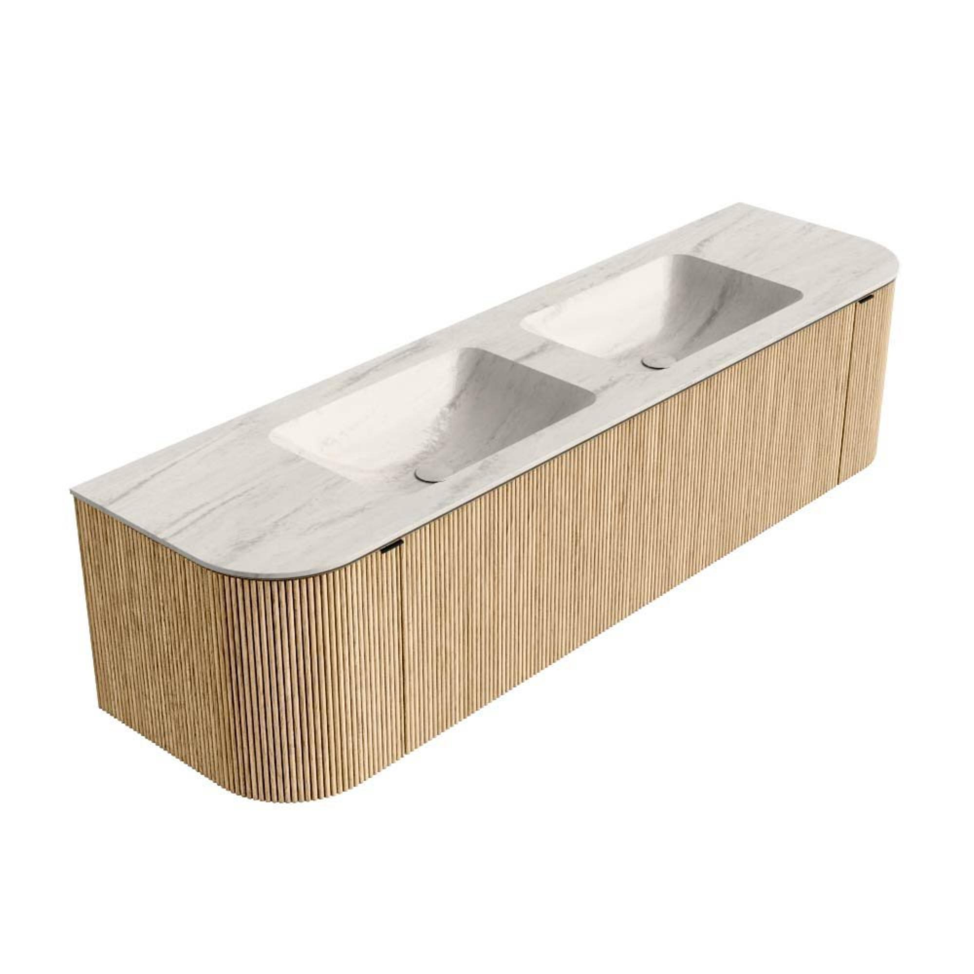 MONDIAZ KURVE-DLUX Meuble de salle de bains 170cm arrondi Gauche + Droite couleur Chêne avec 1 tiroir et 2 portes. Lavabo LEAF Double sans trou de robinet Meli.