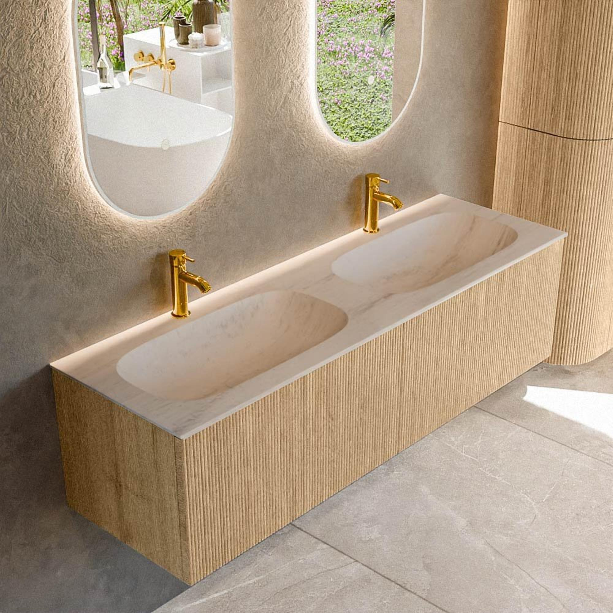 MONDIAZ KURVE-DLUX Meuble de salle de bains 150 cm couleur Oak avec 2 tiroirs et 0 portes. Lavabo STOR SMALL Double 2 trous de robinet Meli.