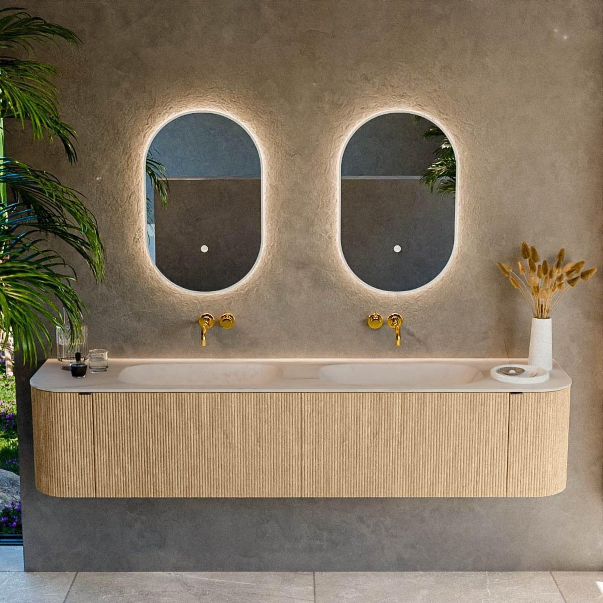 La couleur chêne et la façade à nervures verticales confèrent au meuble une allure luxueuse et mobilier qui fait immédiatement monter votre salle de bains en gamme. La forme arrondie à la fois sur le côté gauche et sur le côté droit adoucit le look et rend l’ensemble chaleureux et accueillant, sans rien céder à un design épuré. C’est précisément cette combinaison de teinte bois naturelle, de texture raffinée et d’angles adoucis qui permet au meuble de s’accorder harmonieusement avec différents styles de carrelage : d’un effet béton sobre à un marbre affirmé ou des carreaux en chevron. La fonction push-to-open fait qu’aucune poignée visible n’est nécessaire, ce qui permet aux façades de s’exprimer pleinement et donne à l’ensemble une apparence minimaliste et haut de gamme comme vous en avez l’habitude dans les hôtels de luxe et les magazines de design.