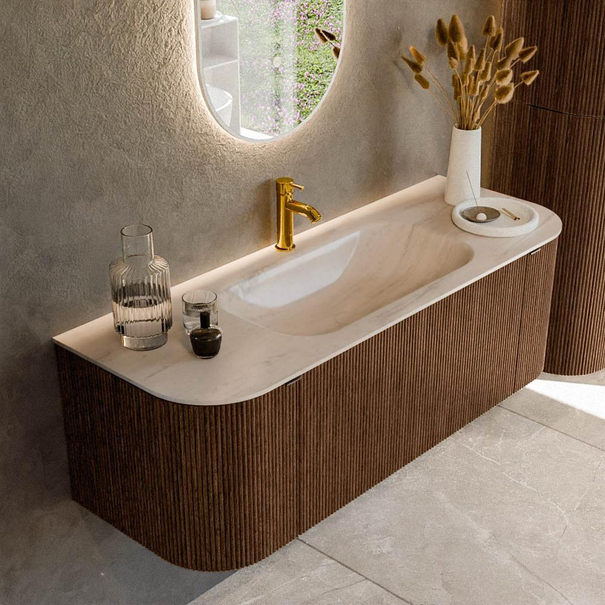 MONDIAZ KURVE-DLUX Meuble de salle de bains 130cm arrondi Gauche + Droite couleur Walnut avec 1 tiroir et 2 portes. Lavabo BIG SMALL Central 1 trou de robinet Meli.