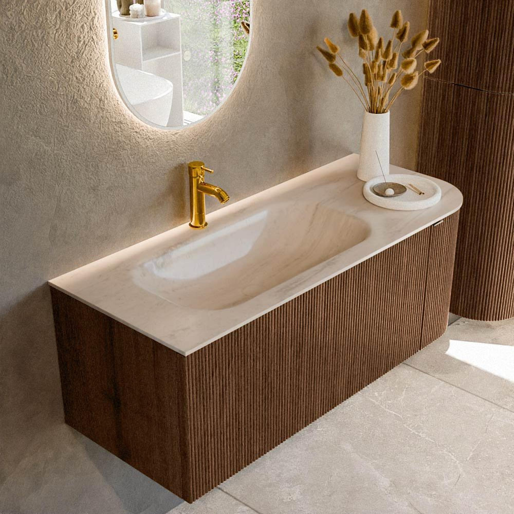 MONDIAZ KURVE-DLUX Meuble de salle de bains 115cm arrondi Droite couleur Walnut avec 1 tiroir et 1 porte. Lavabo BIG SMALL Gauche 1 trou de robinet Meli.