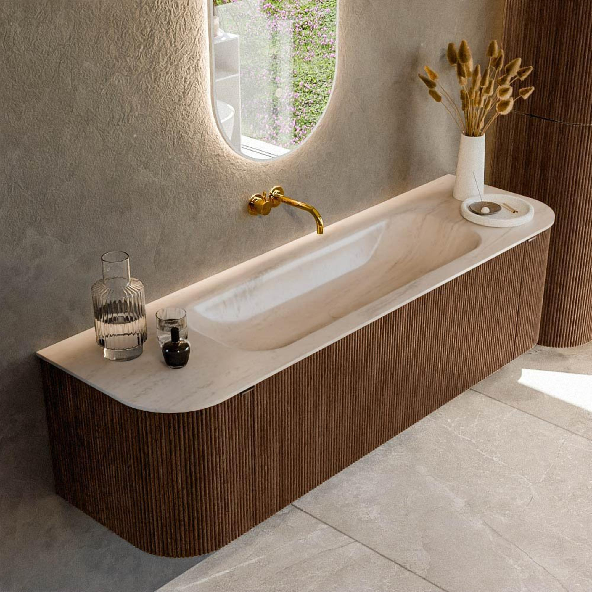 La couleur walnut donne au meuble une apparence riche et chaleureuse qui se marie à merveille avec des carreaux blancs, un effet béton, de la pierre naturelle ou des murs sombres. Les angles arrondis à gauche et à droite adoucissent le dessin et assurent un look luxueux et sur mesure. Grâce à la façade à nervures verticales, un jeu de lignes subtil se crée, ajoutant de la profondeur et du caractère sans être criard. Cela rend le meuble particulièrement adapté à ceux qui souhaitent créer une ambiance chic d'hôtel ou de spa. L'aspect bois s'inscrit dans une gamme de couleurs bois populaires, ce qui vous permet de le combiner facilement avec d'autres accessoires en bois ou meubles de salle de bains dans une teinte similaire.